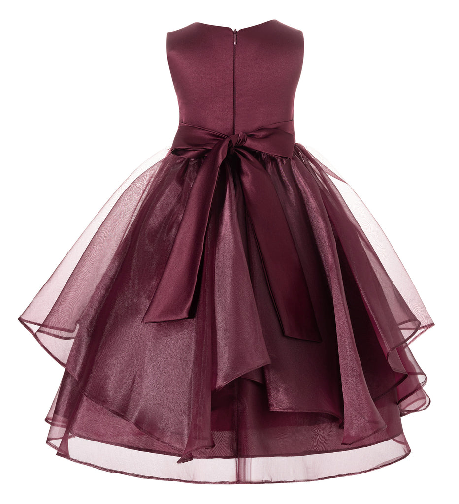 - The elegant feature is made out of satin top and beautifullly layered asymmetric ruffle skirt. The back of the dress has a zipper closure and the waistline is decorated with attached sequin sash to make this dress more elegant.