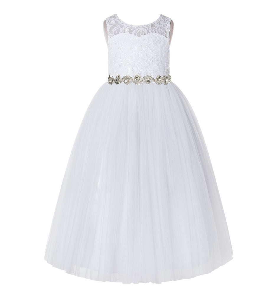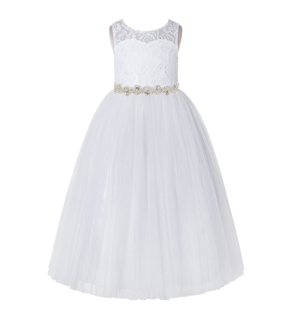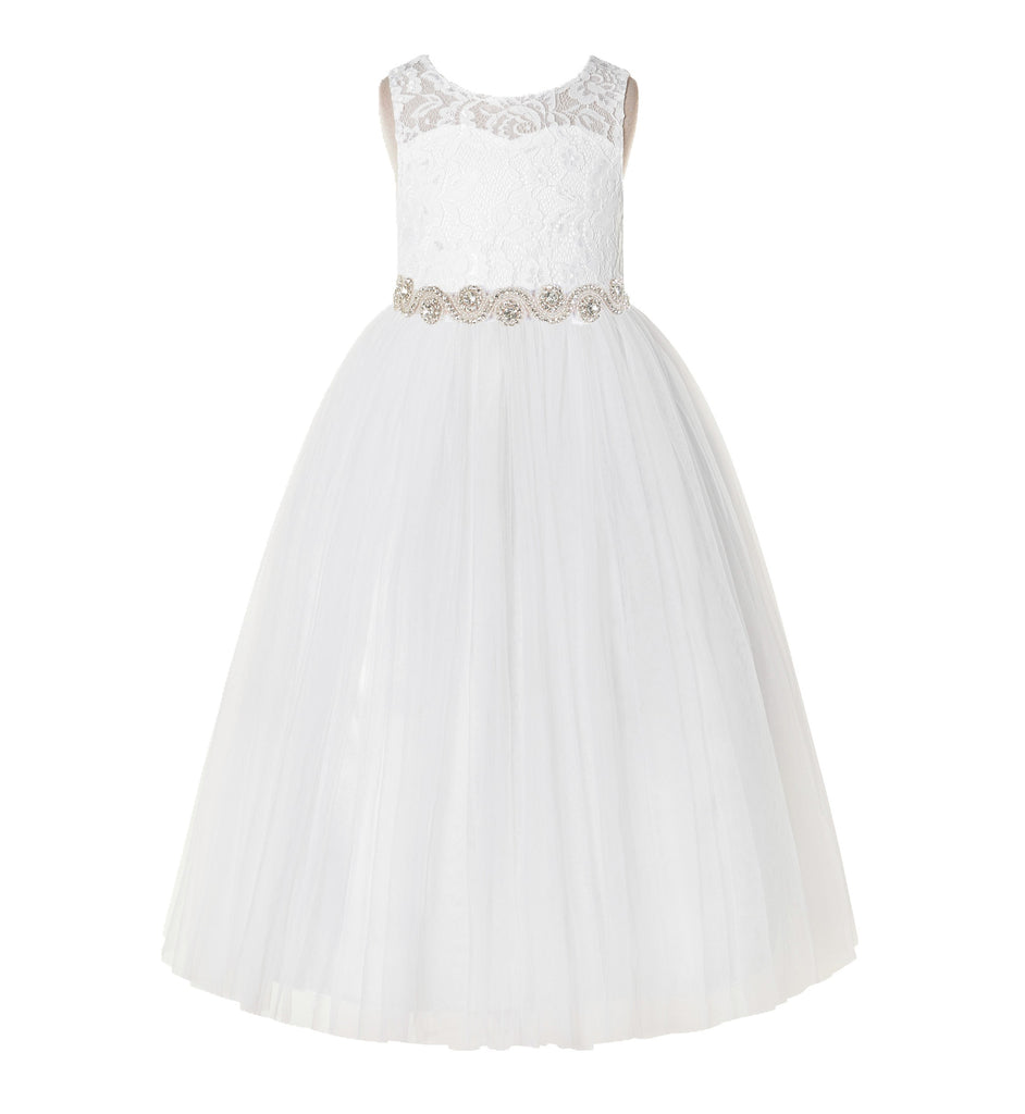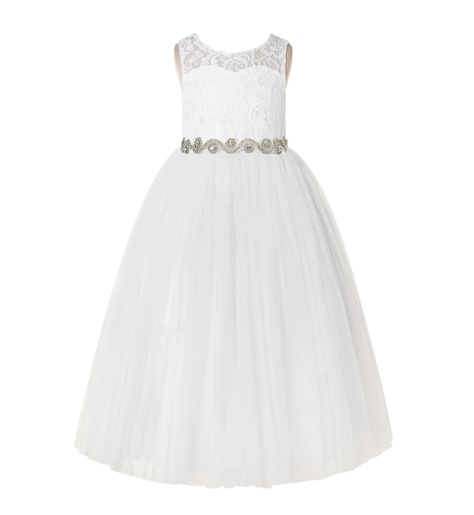 Illusion Lace Tulle Keyhole Back Flower Girl Dress with Rhinestone Sash Junior Bridesmaid 178R2