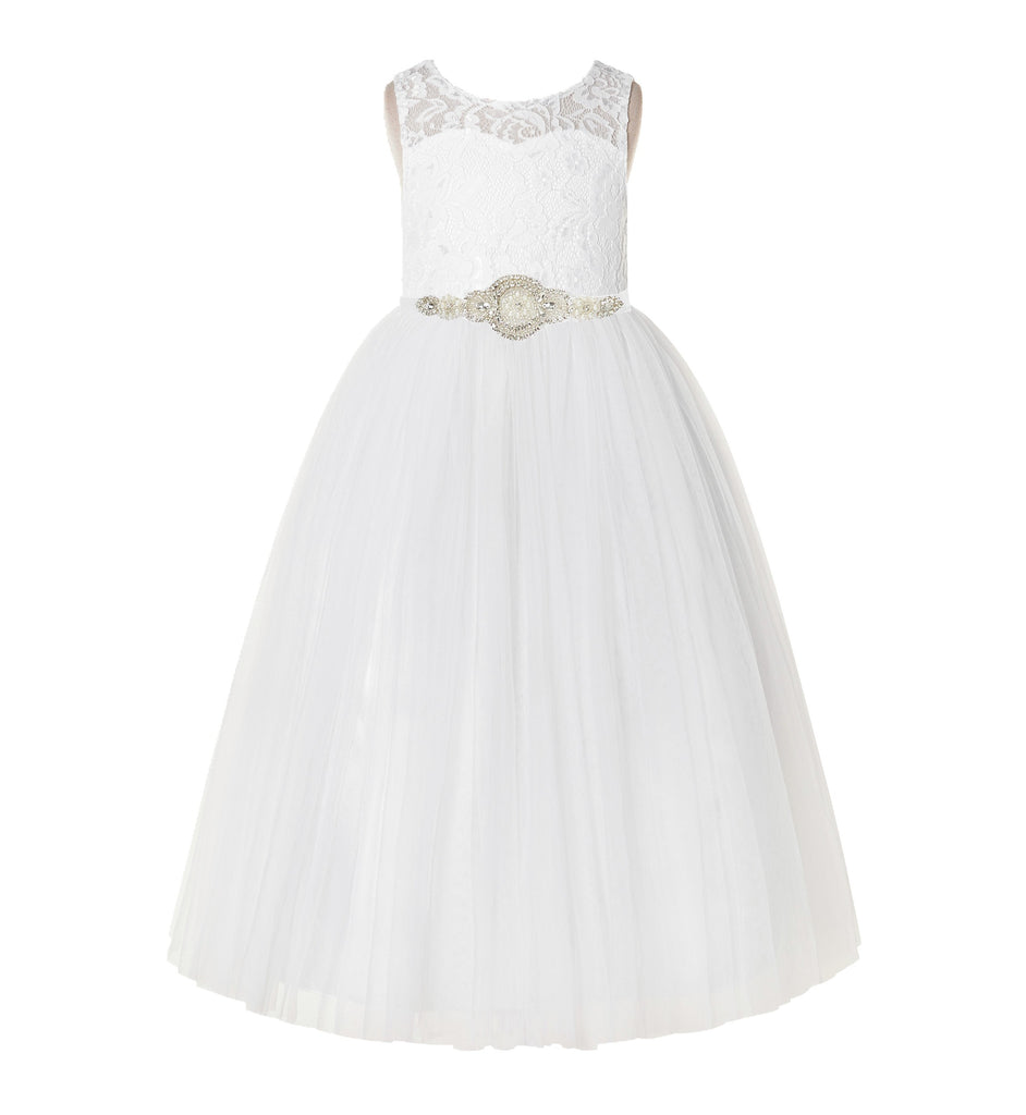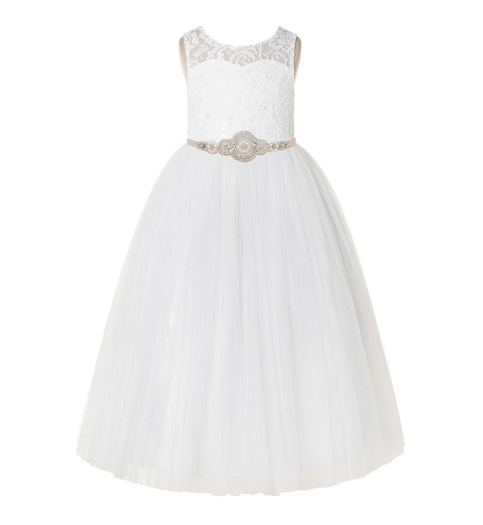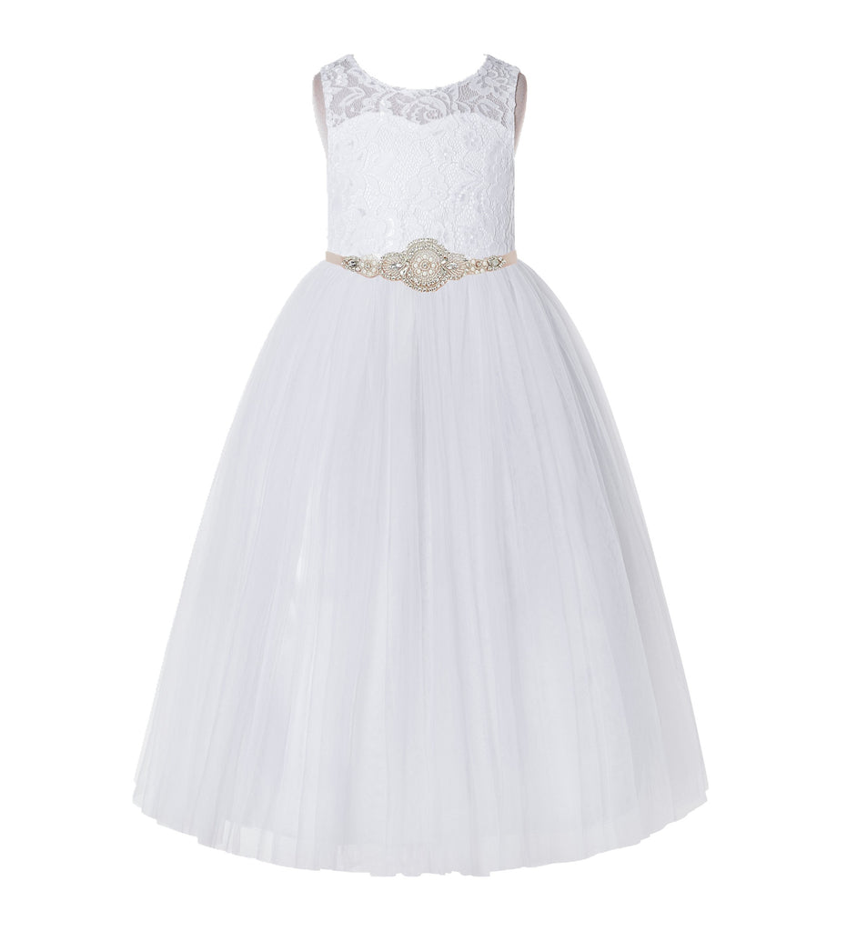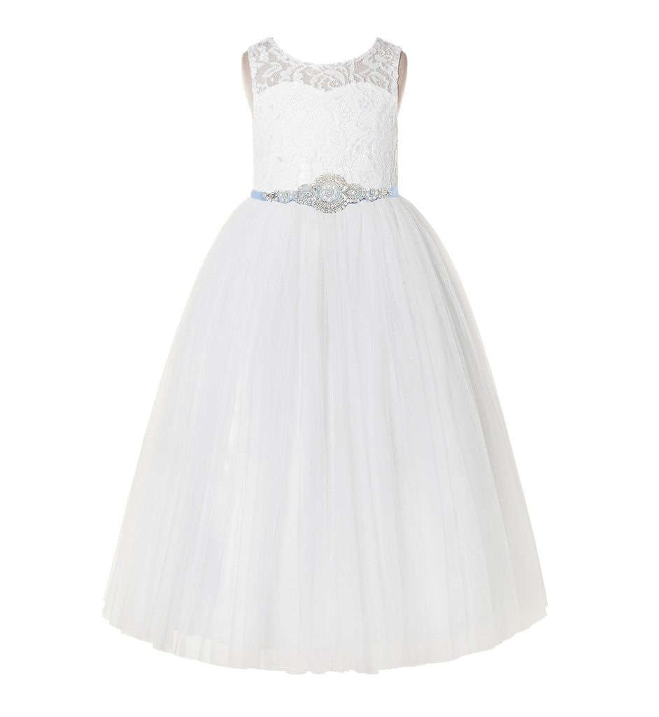 Open Back A-Line Lace Tulle Flower Girl Dress with Rhinestone Beaded Sash for Dance Recital 178R7