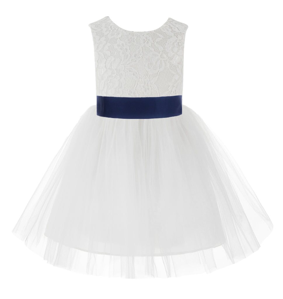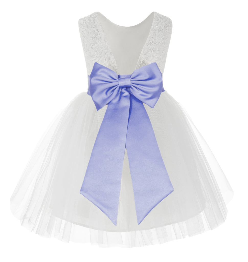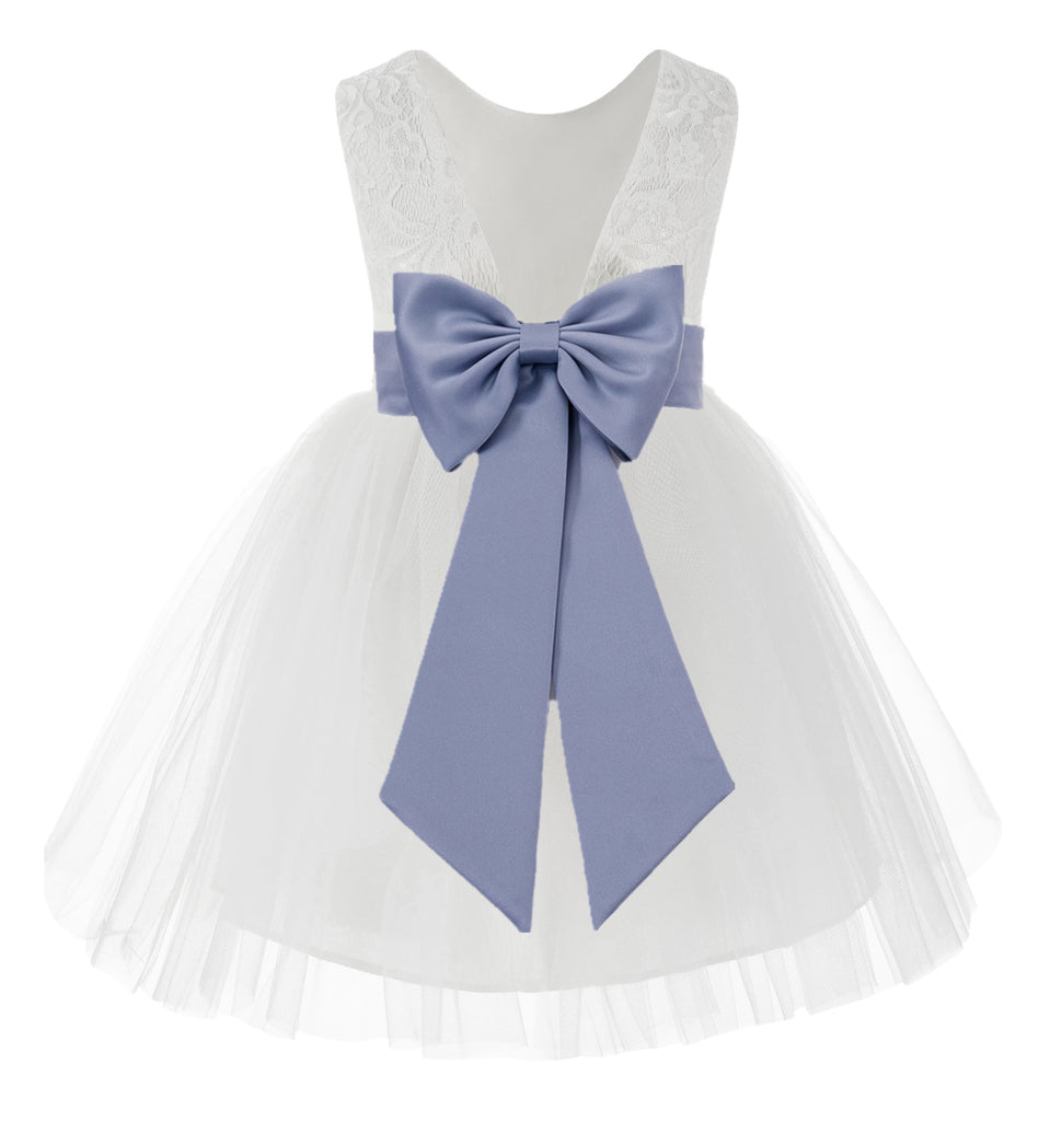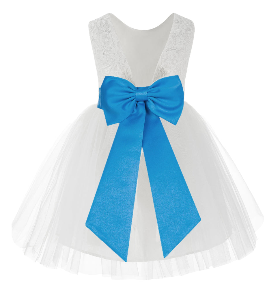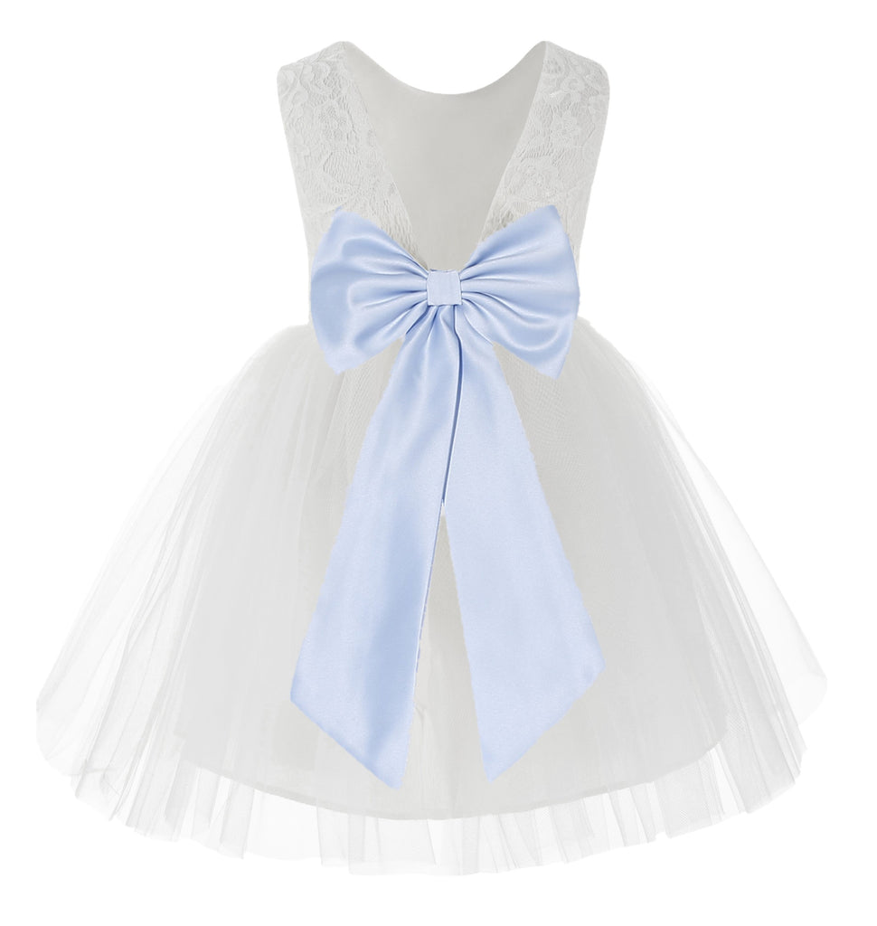 Knee Length White Lace V-Back Flower Girl Dress with Tiebow for Toddlers Ceremonial Gown 206T(1)