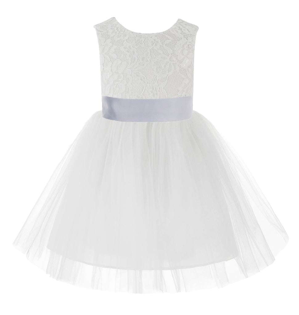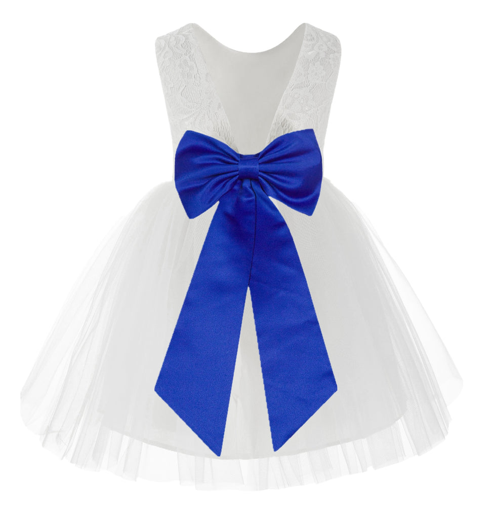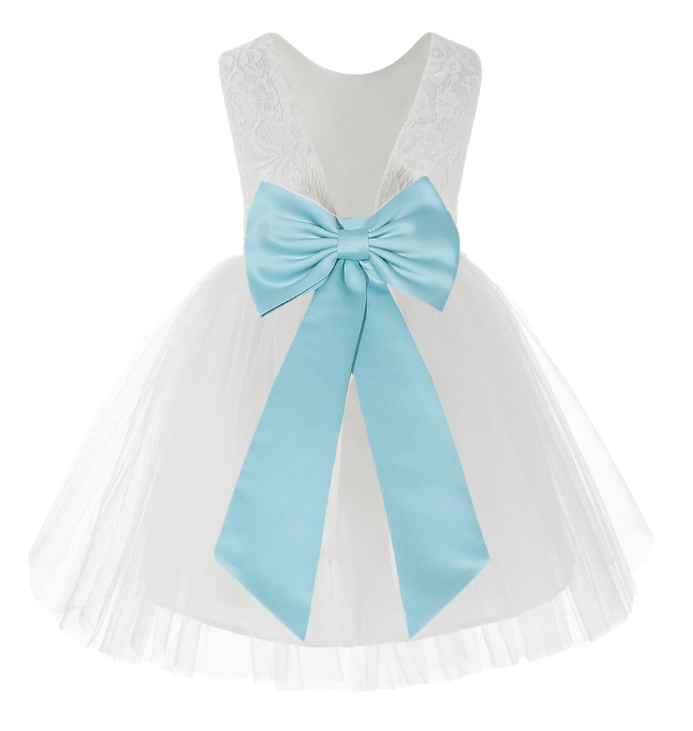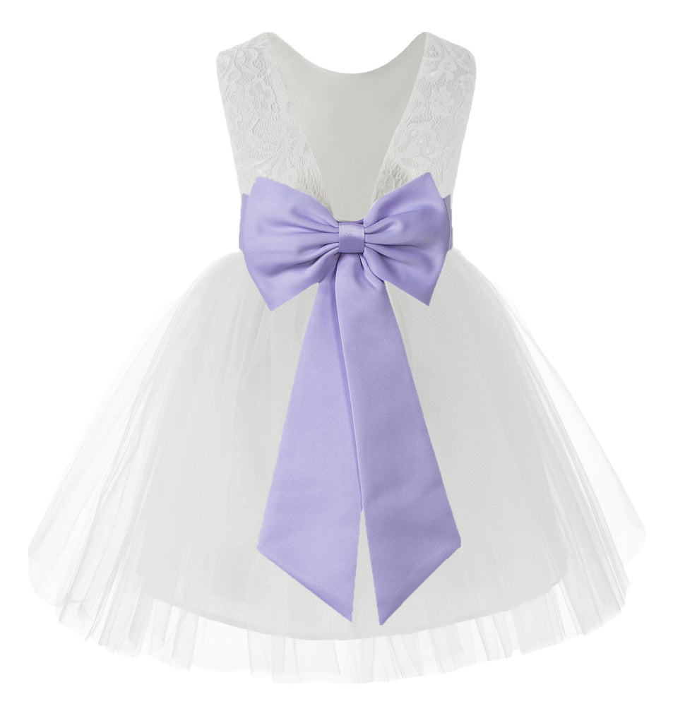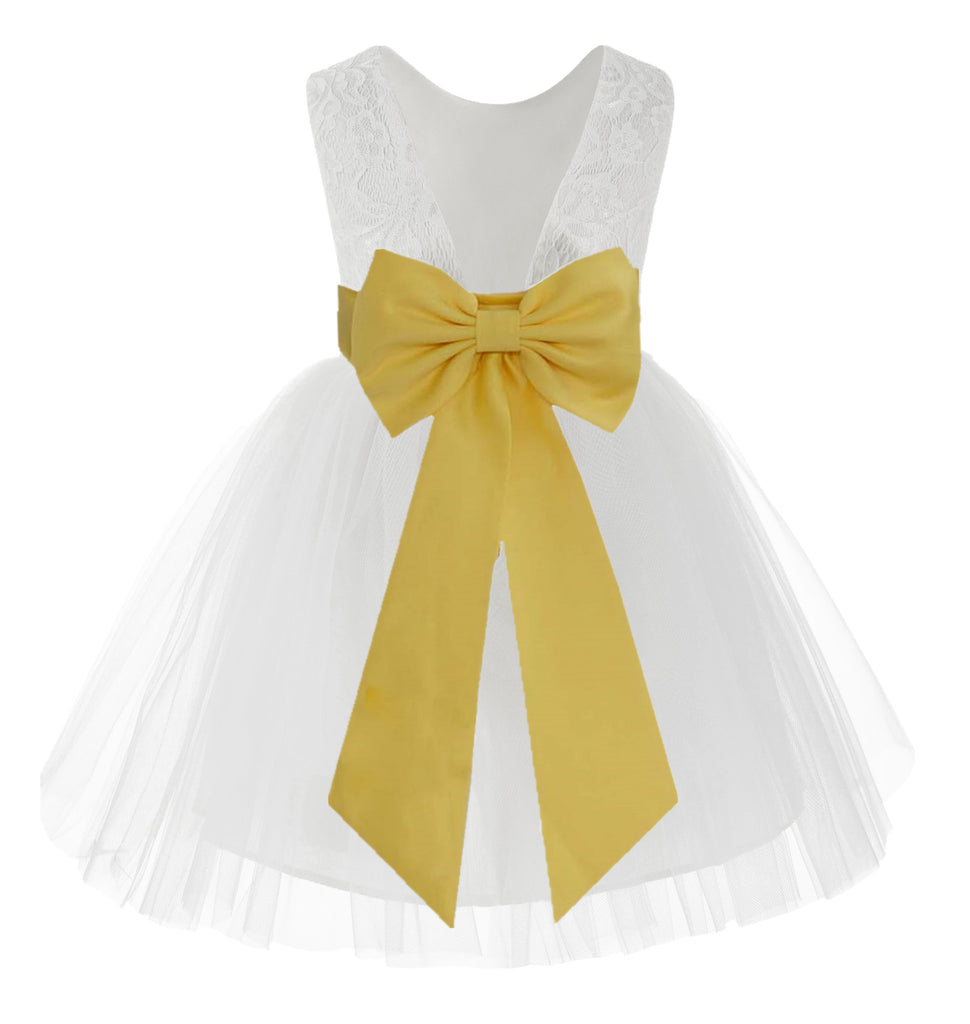 Knee Length White Lace V-Back Flower Girl Dress with Tiebow for Toddlers Ceremonial Gown 206T(2)