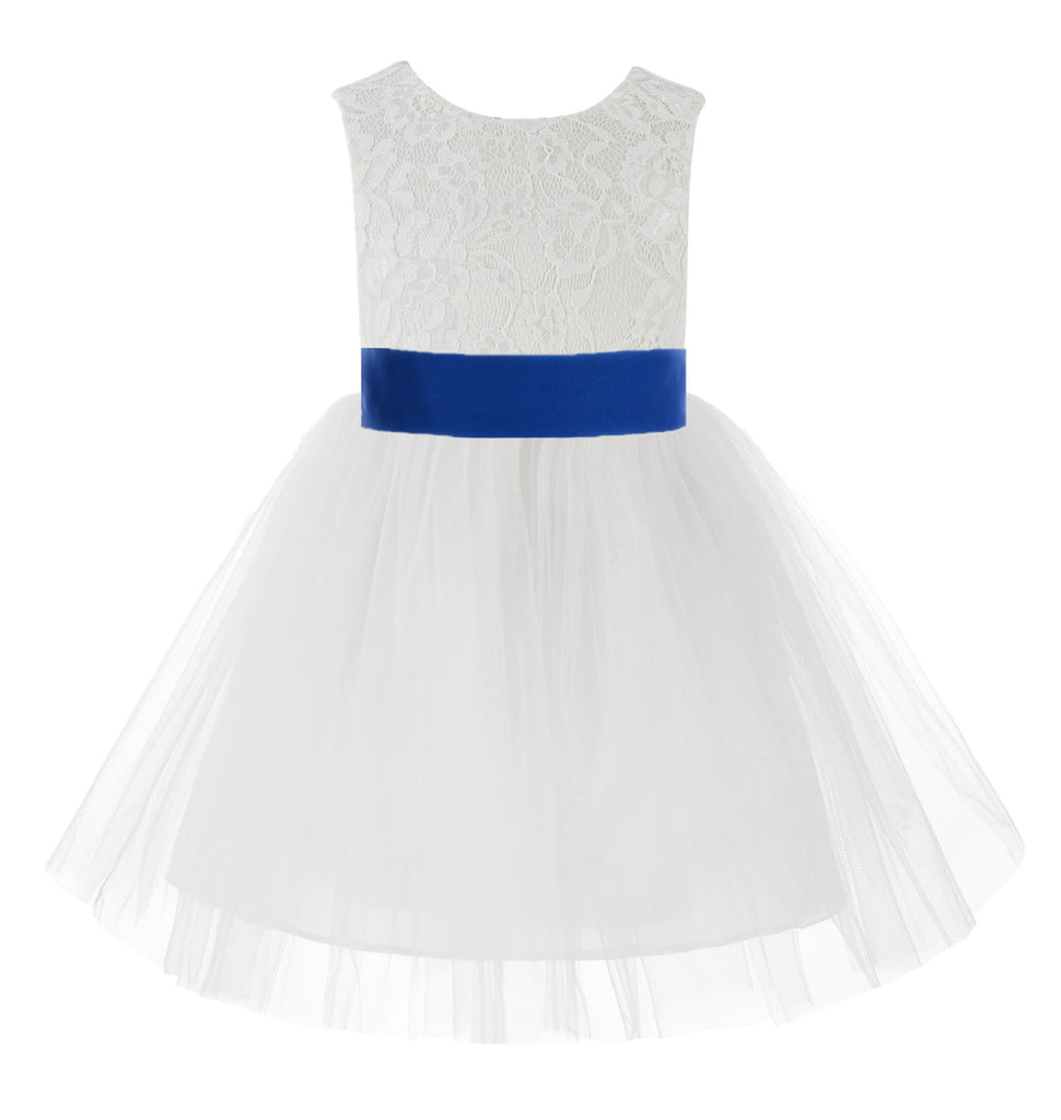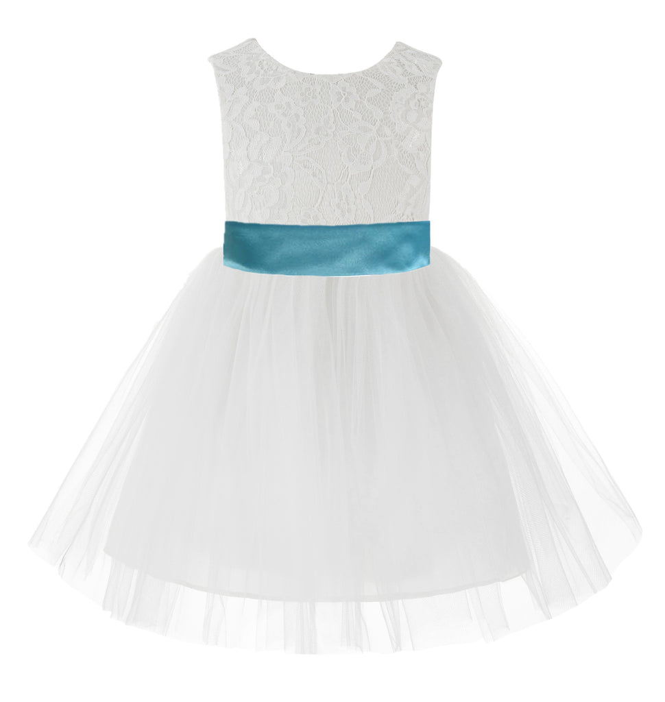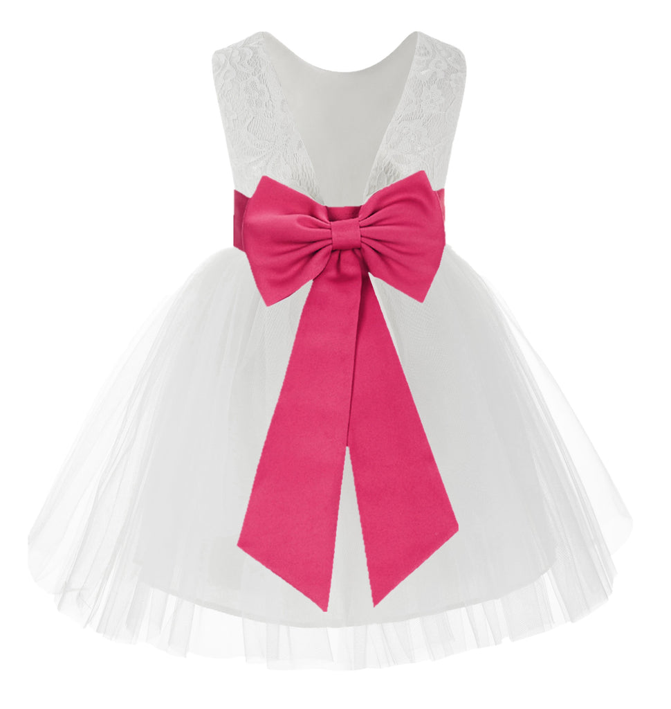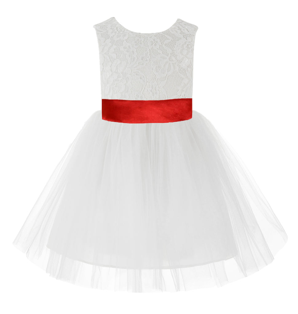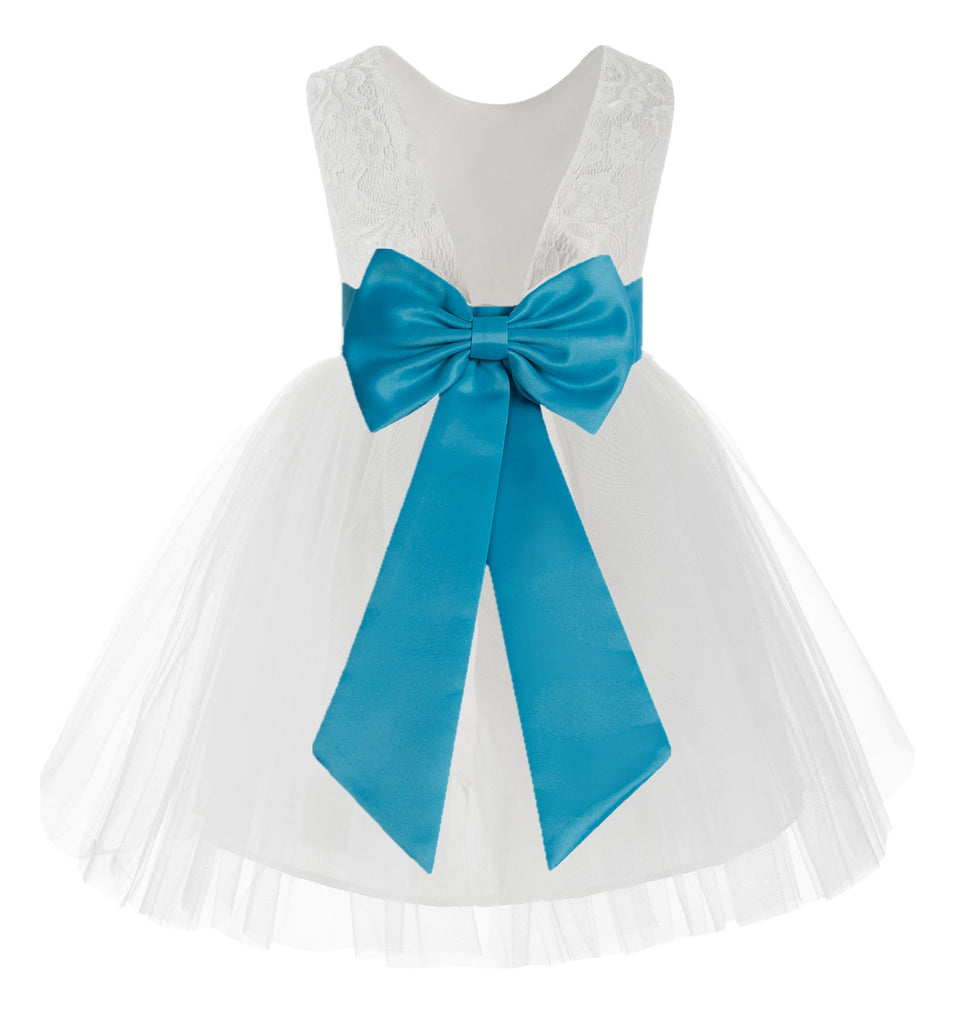 Knee Length White Lace V-Back Flower Girl Dress with Tiebow for Toddlers Ceremonial Gown 206T(2)