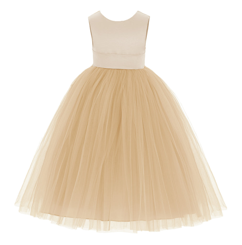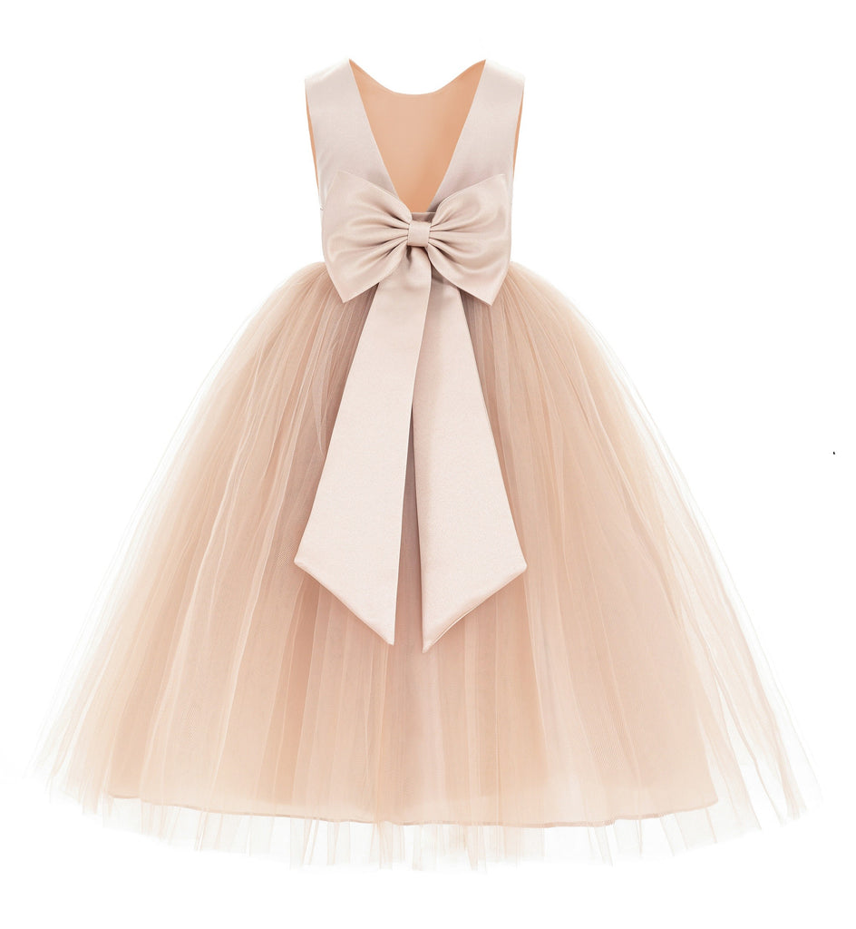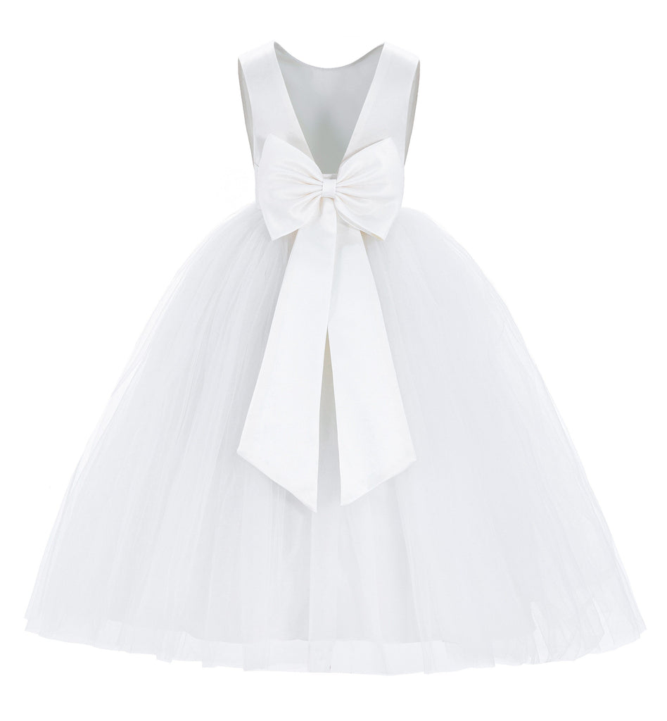 - This gorgeous flower girl dress features a open back satin bodice with elegant tulle skirt.