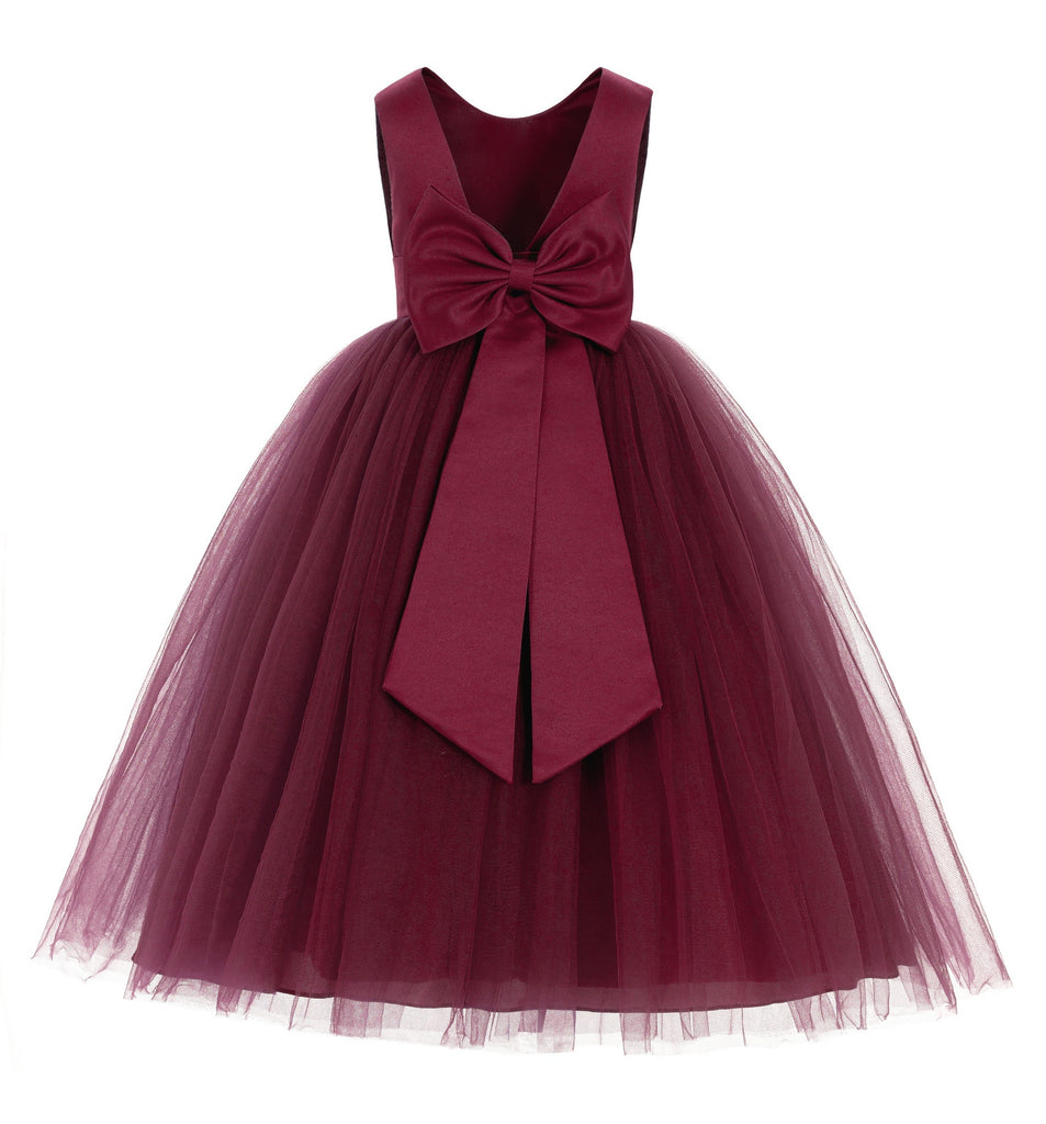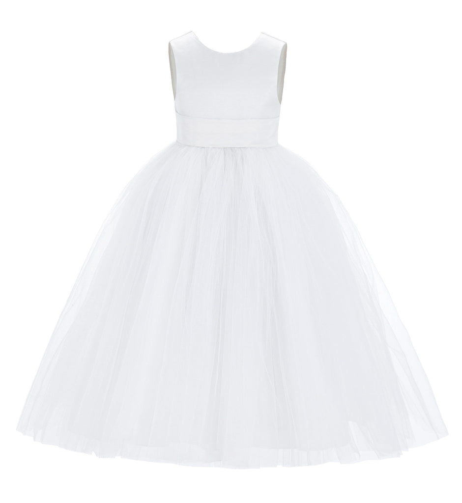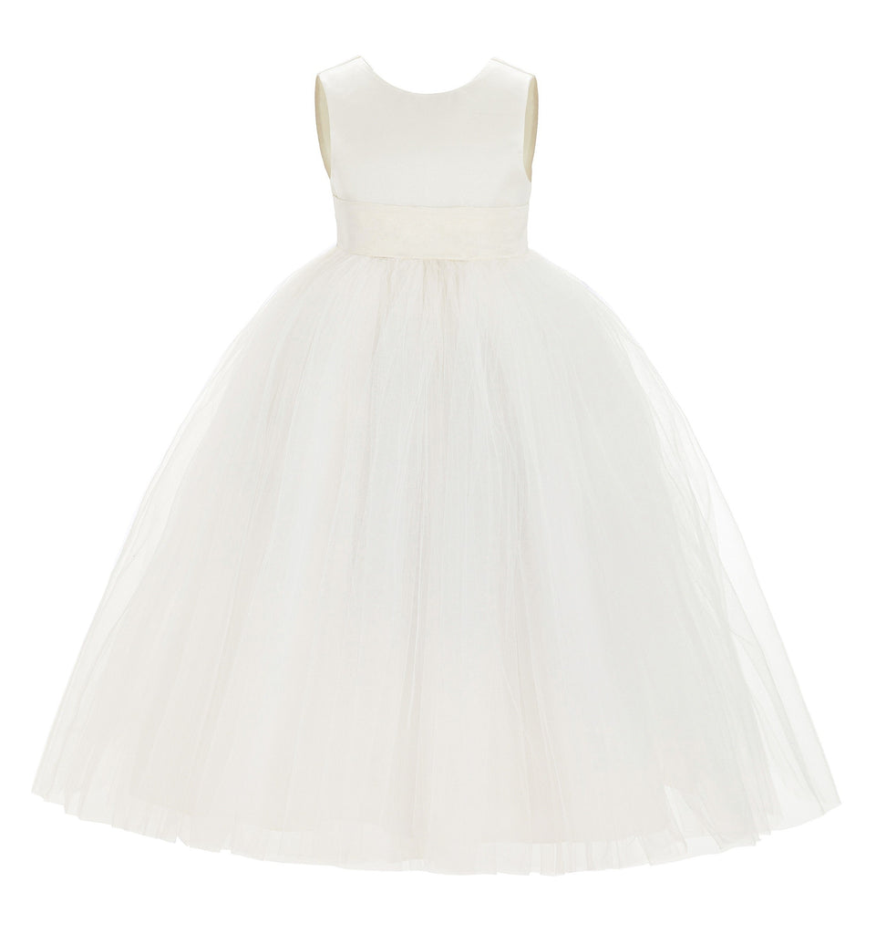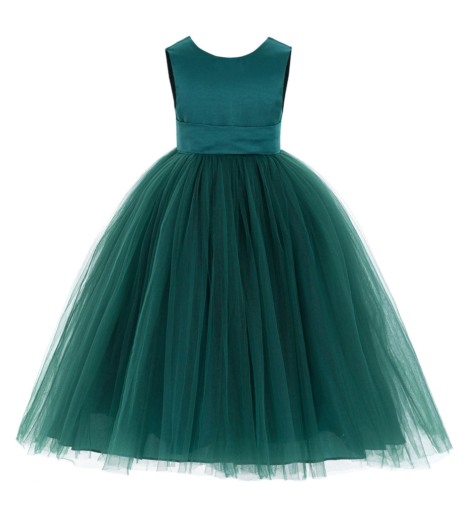 - This gorgeous flower girl dress features a open back satin bodice with elegant tulle skirt.