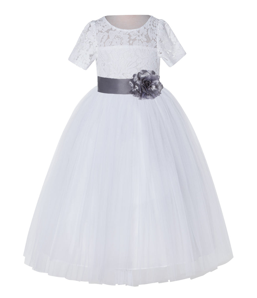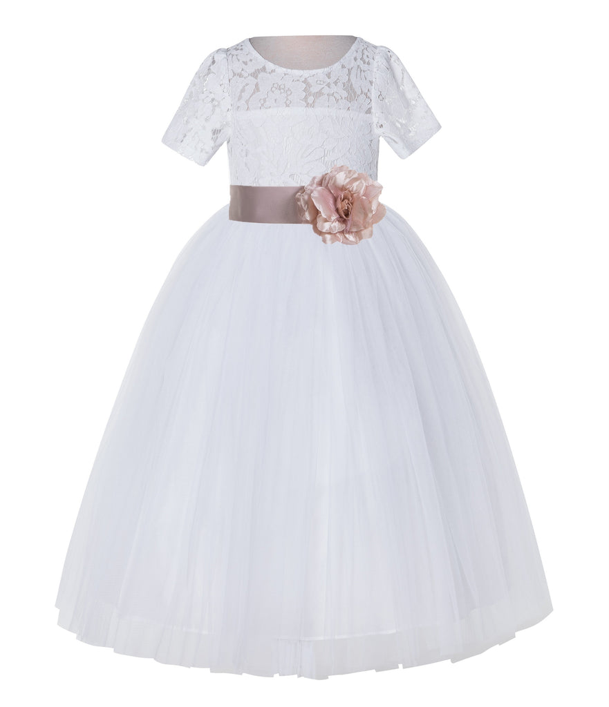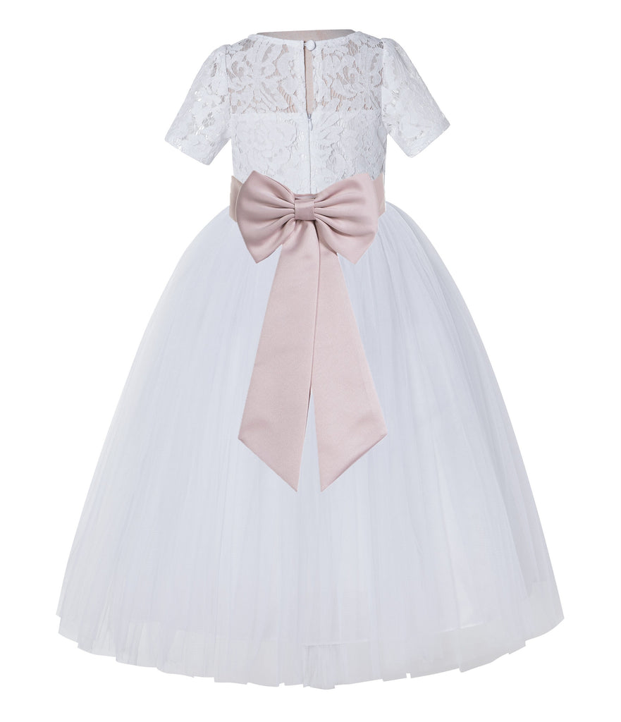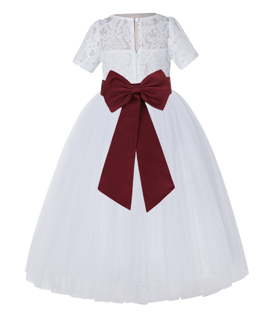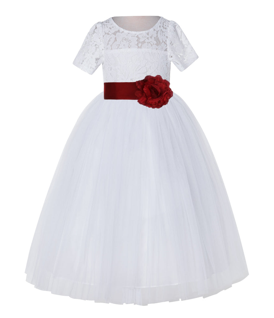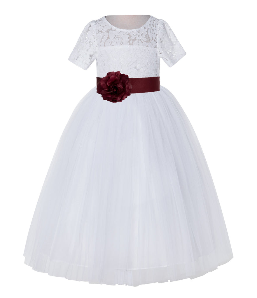 White Floral Lace Flower Girl Dress with Sleeves Junior Bridesmaid Gown Wedding Reception LG2T(4)
