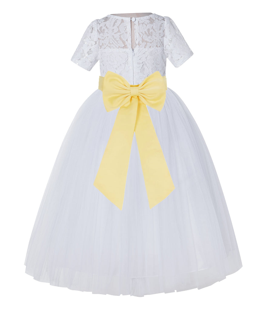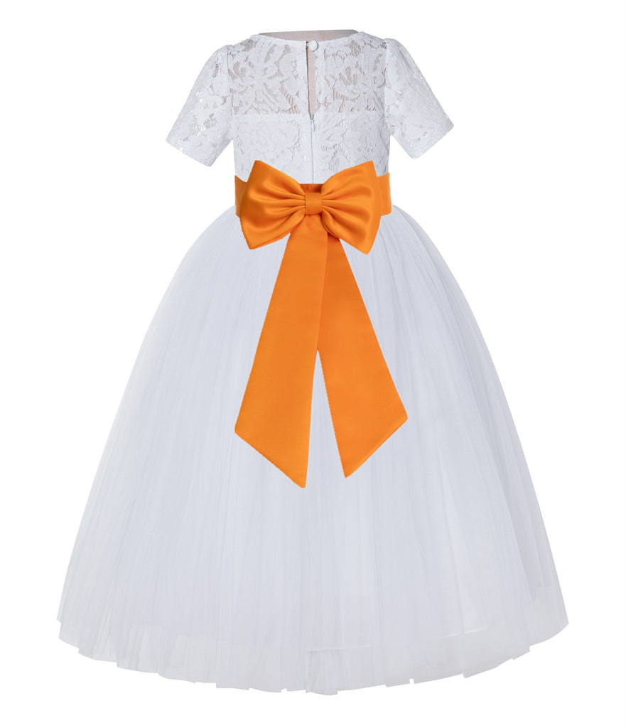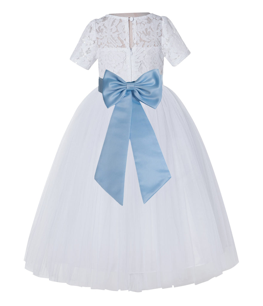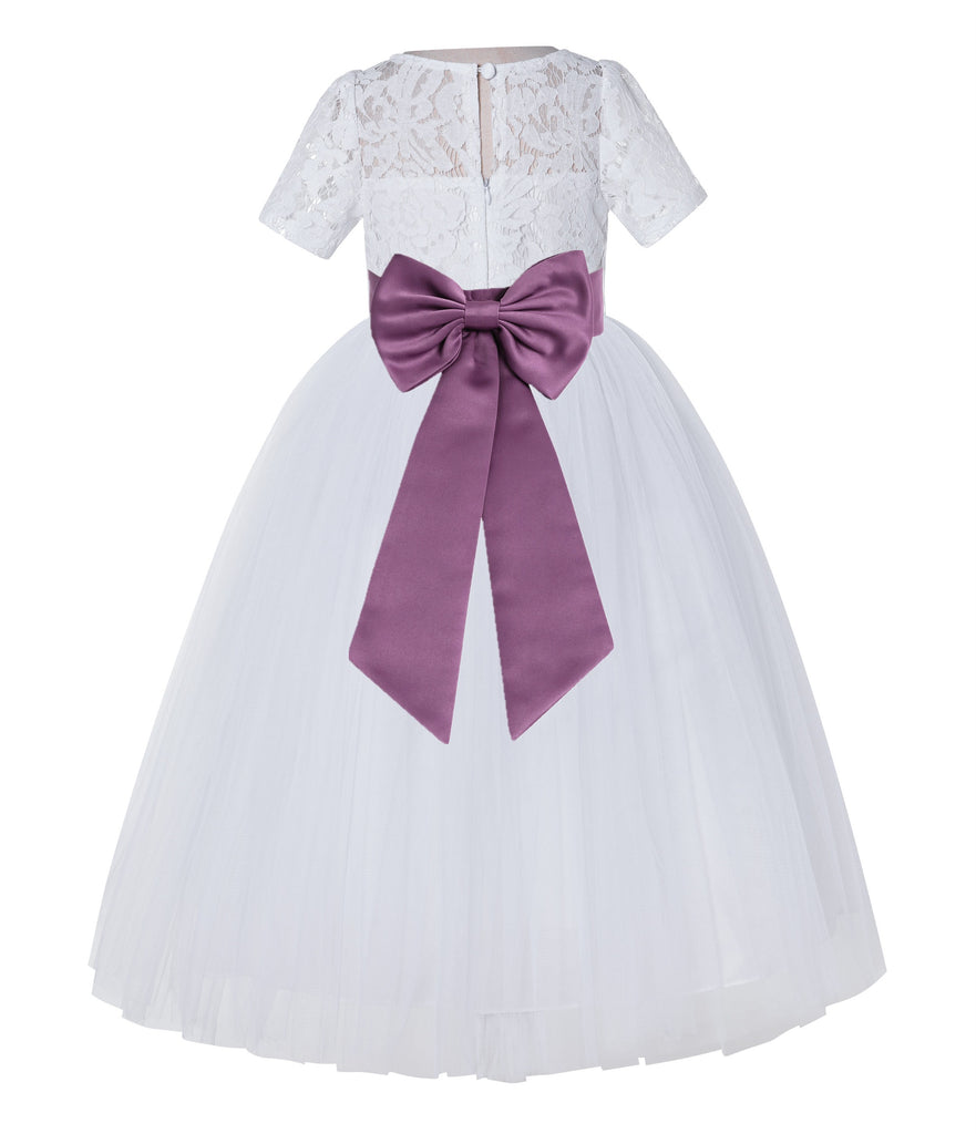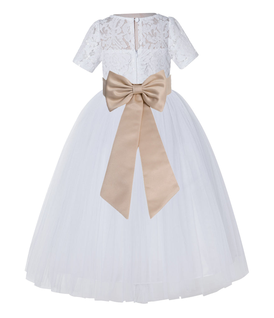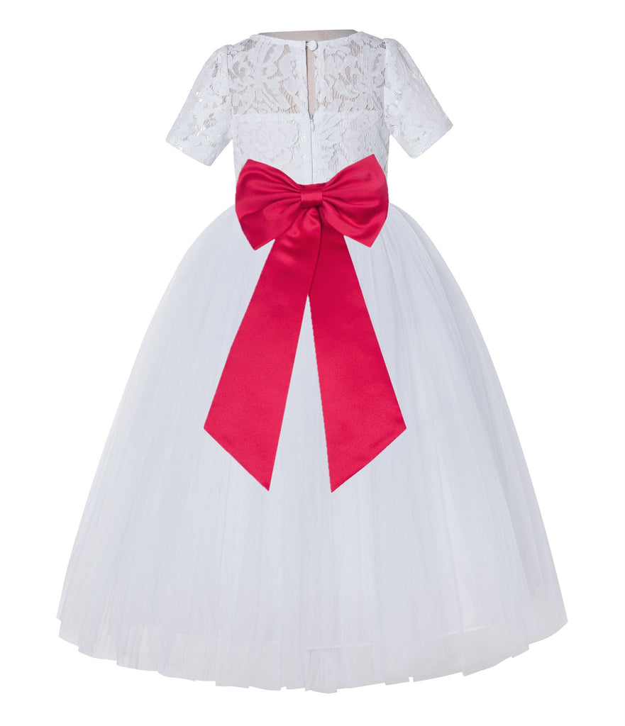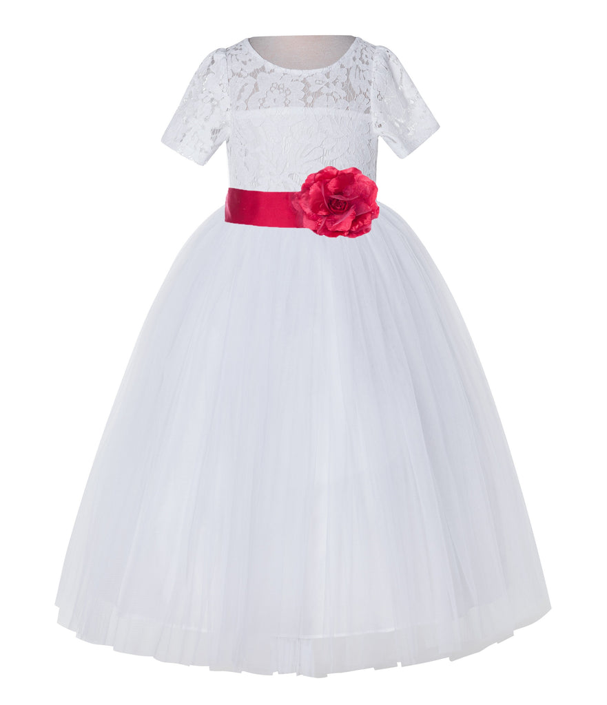 White Floral Lace Flower Girl Dress with Sleeves Junior Bridesmaid Gown Wedding Reception LG2T(4)