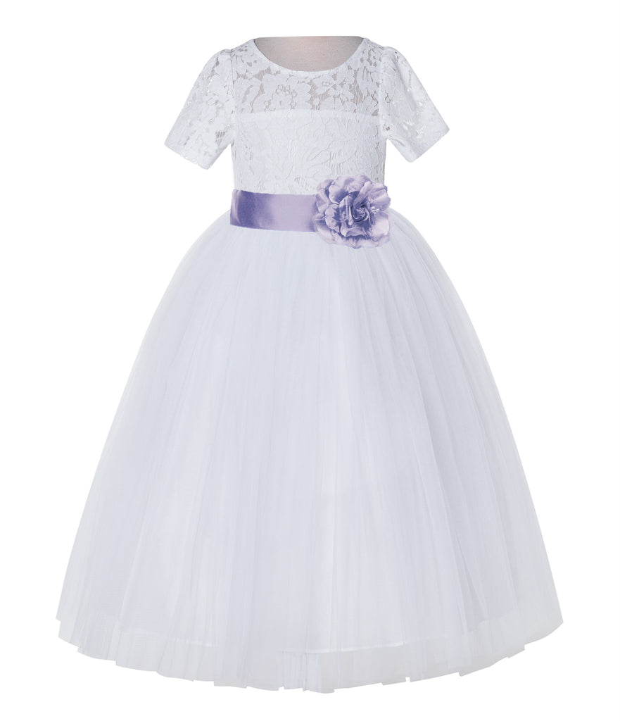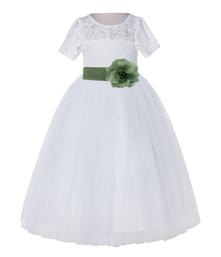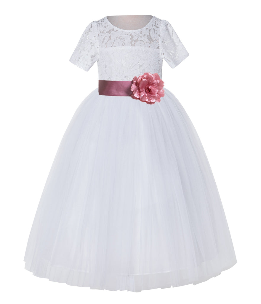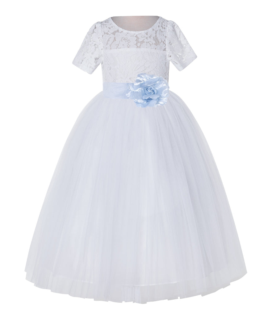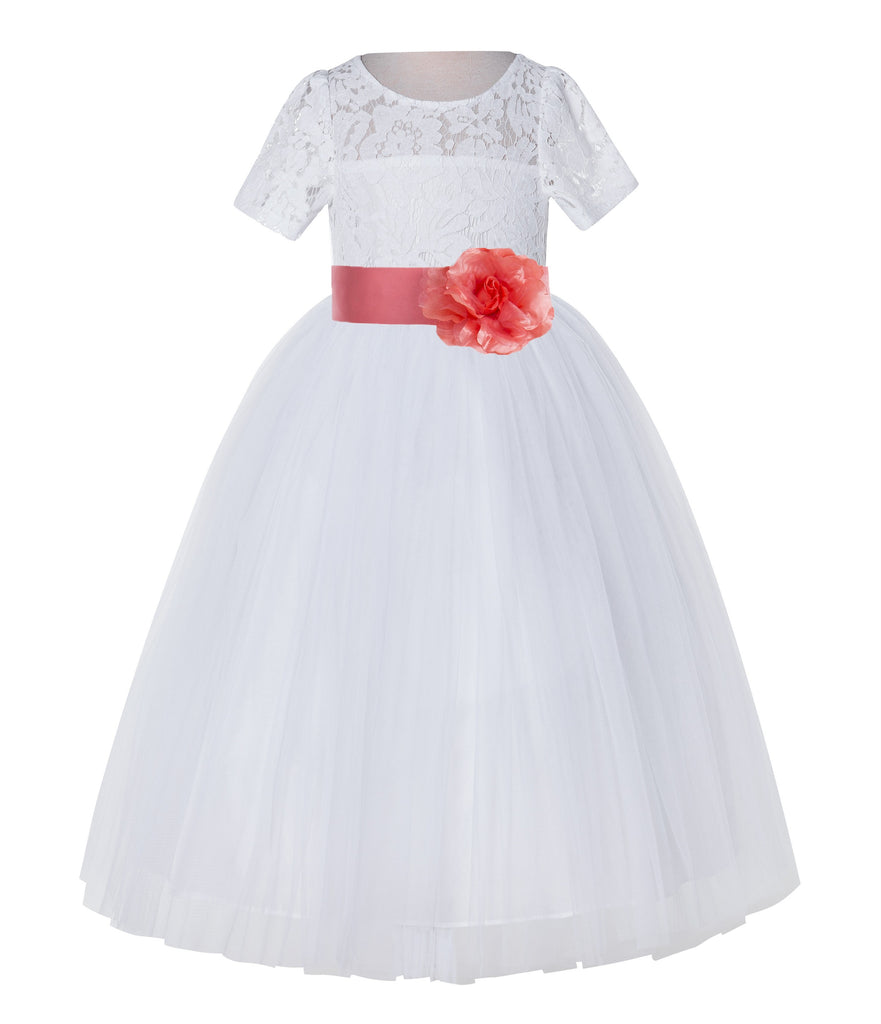 White Floral Lace Flower Girl Dress with Sleeves Junior Bridesmaid Gown Wedding Reception LG2T(5)