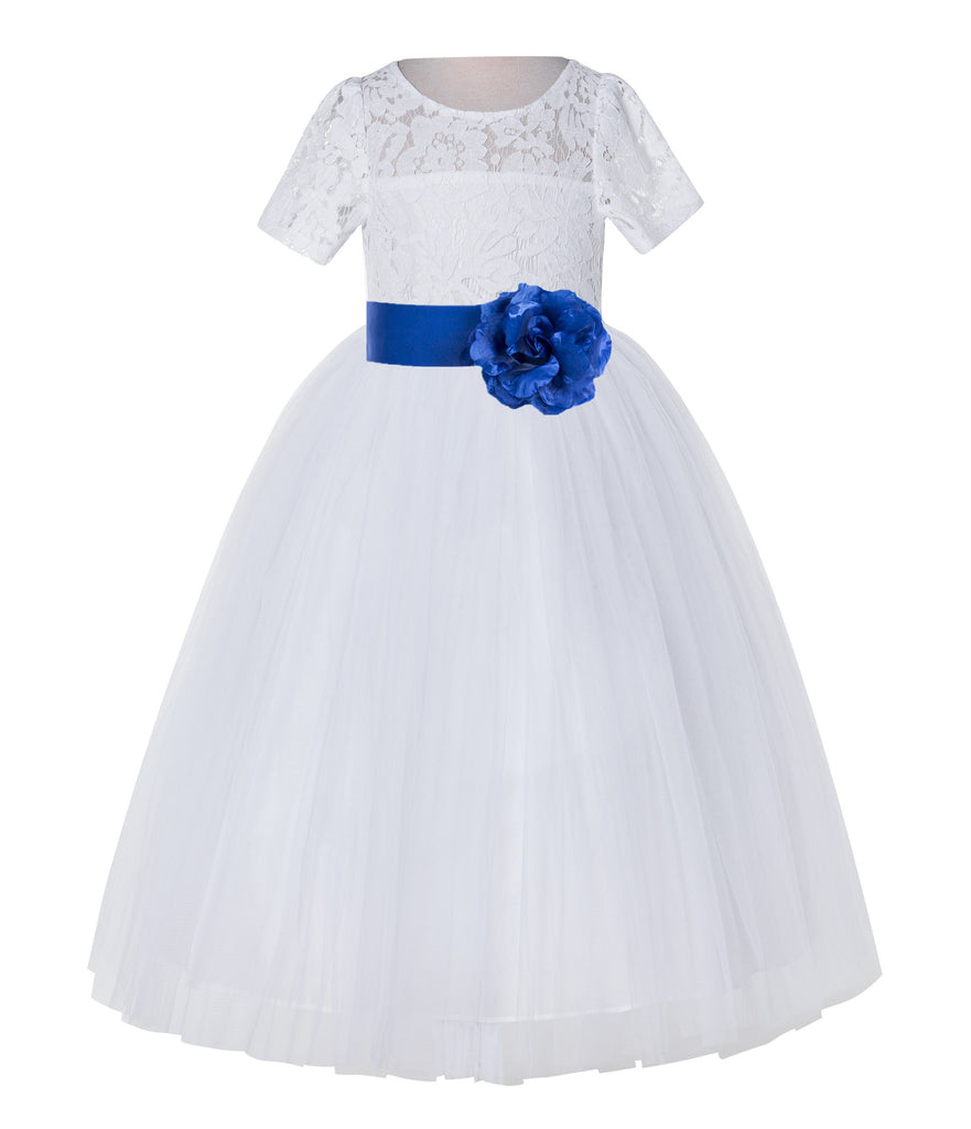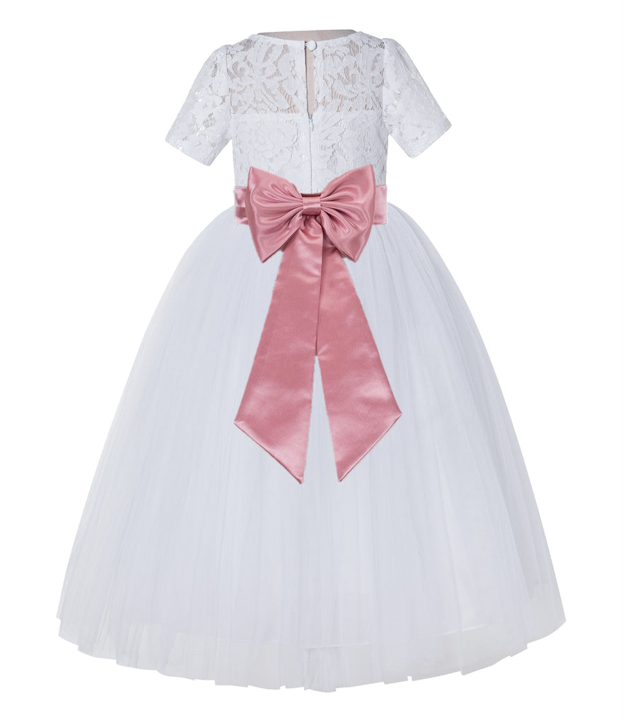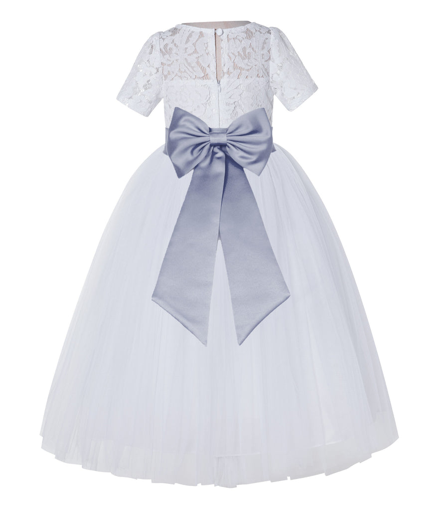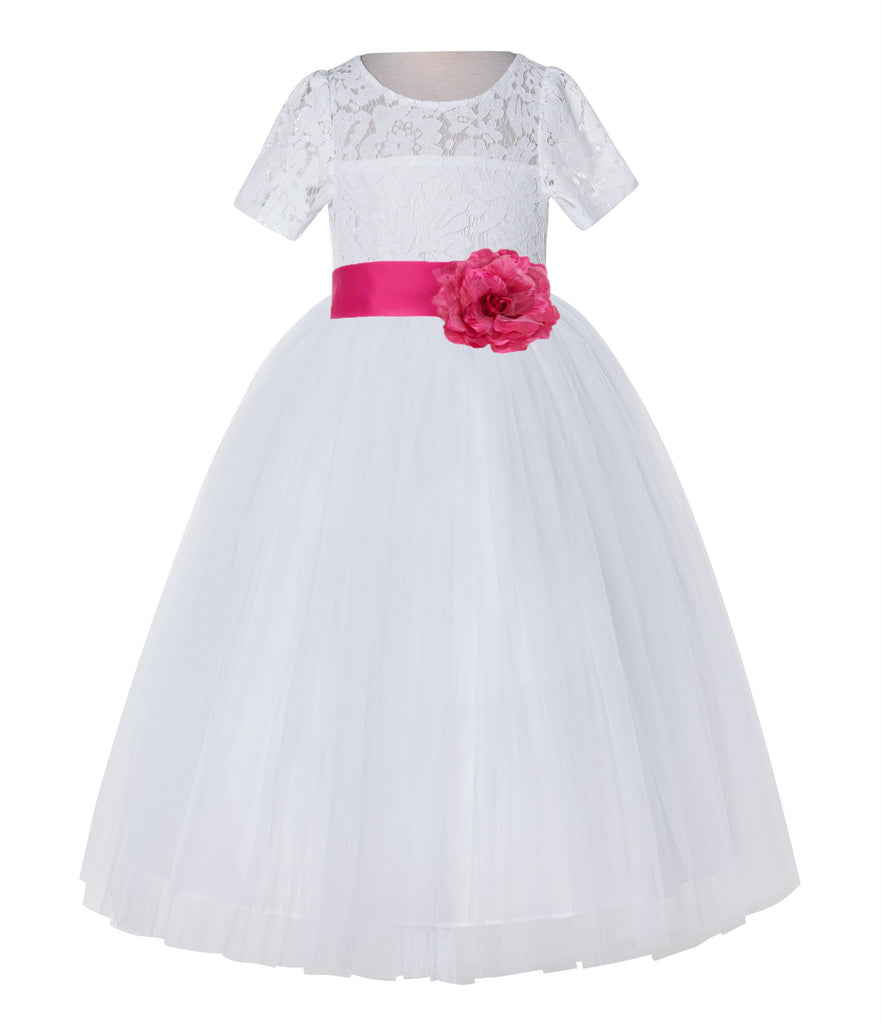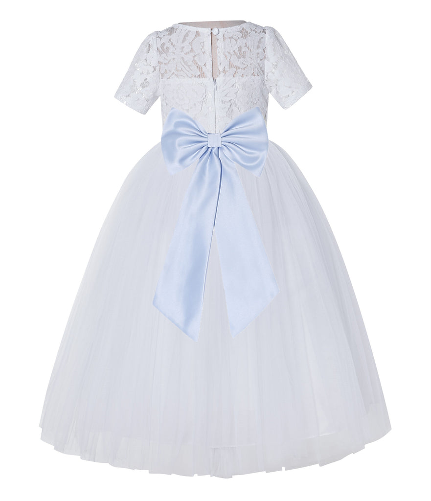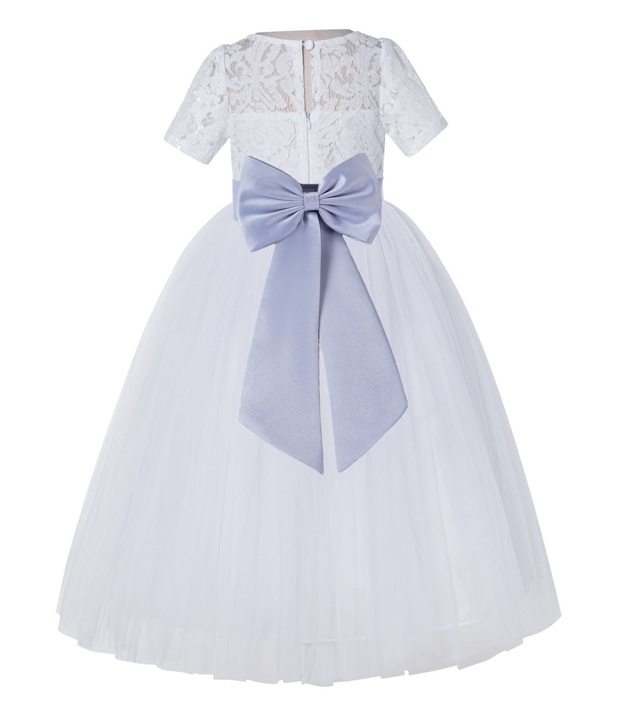 White Floral Lace Flower Girl Dress with Sleeves Junior Bridesmaid Gown Wedding Reception LG2T(5)