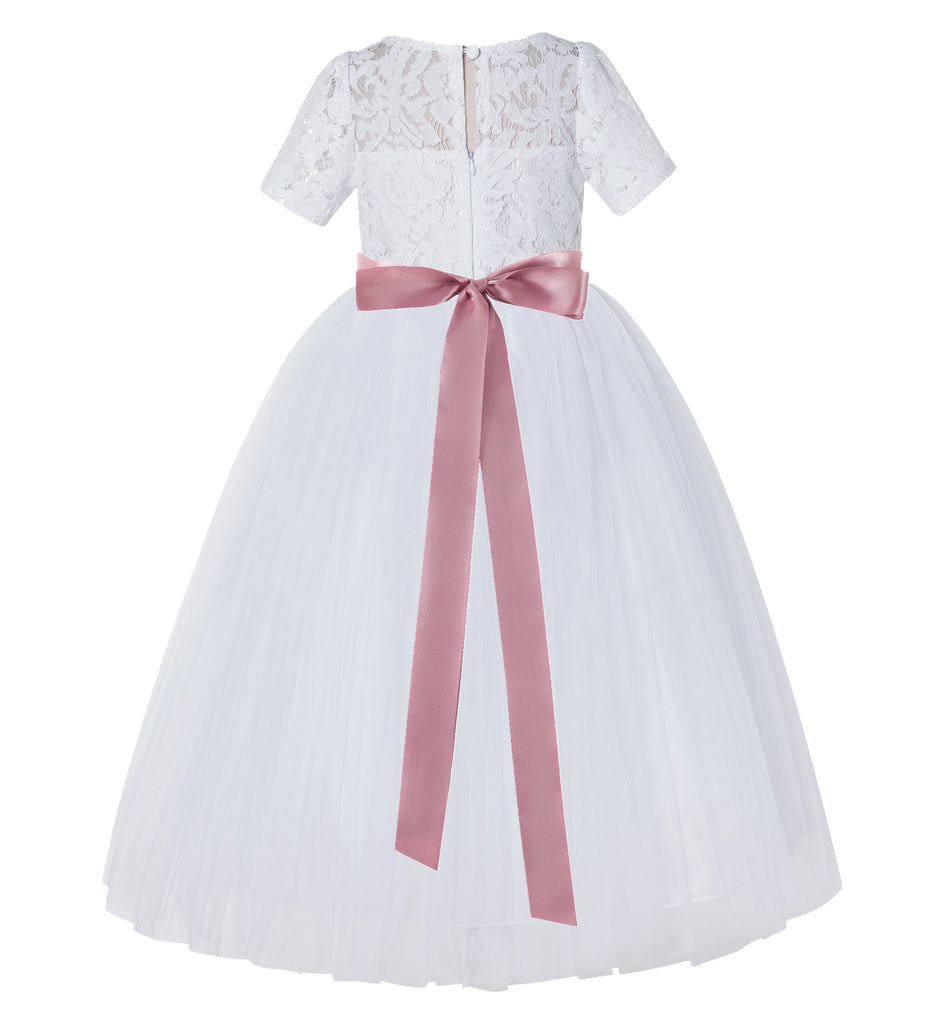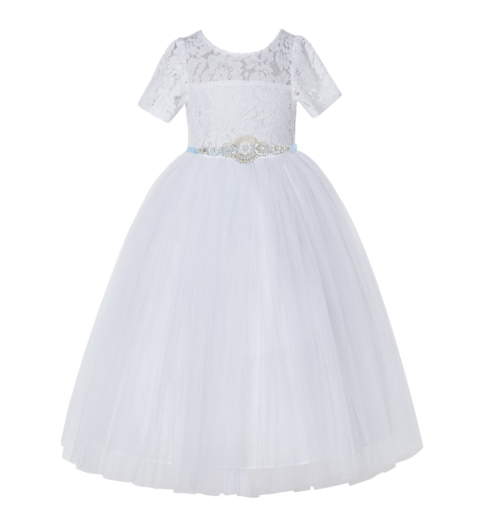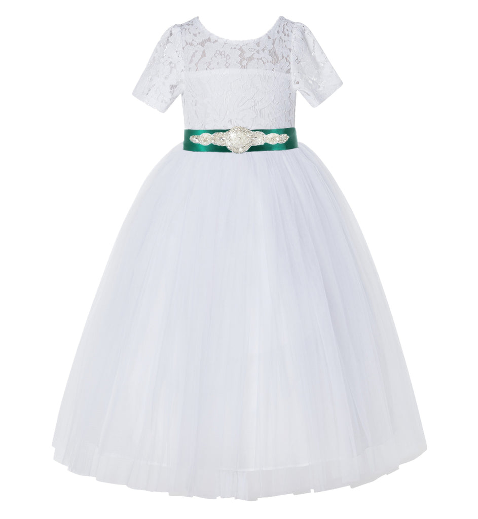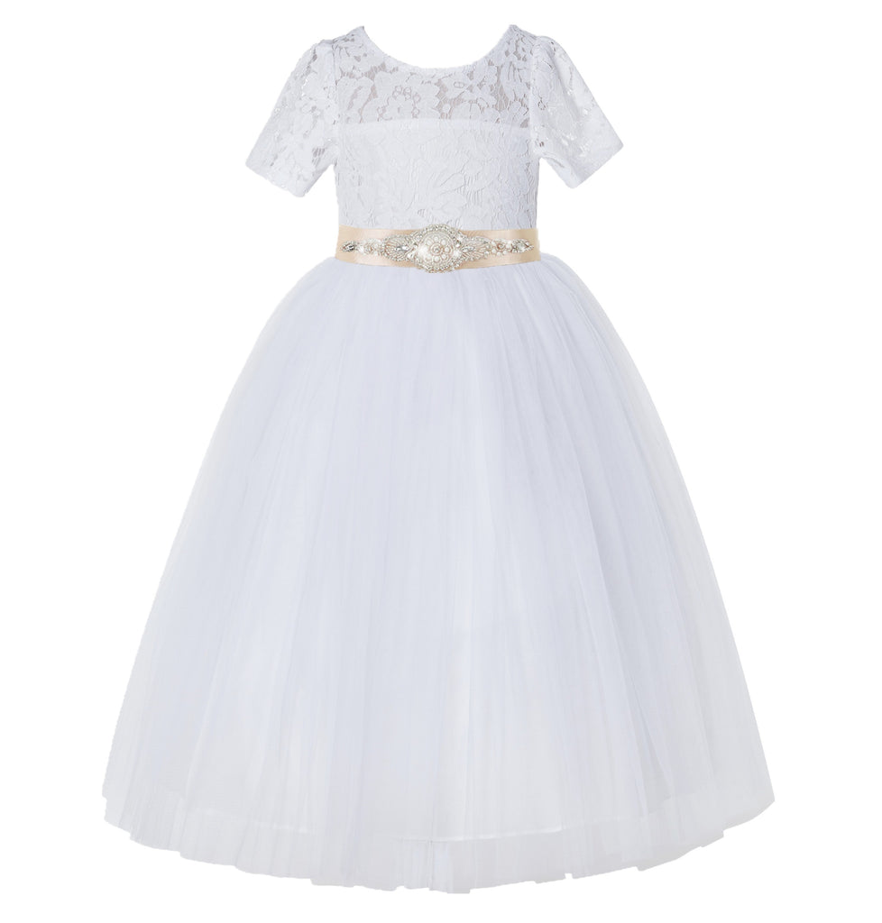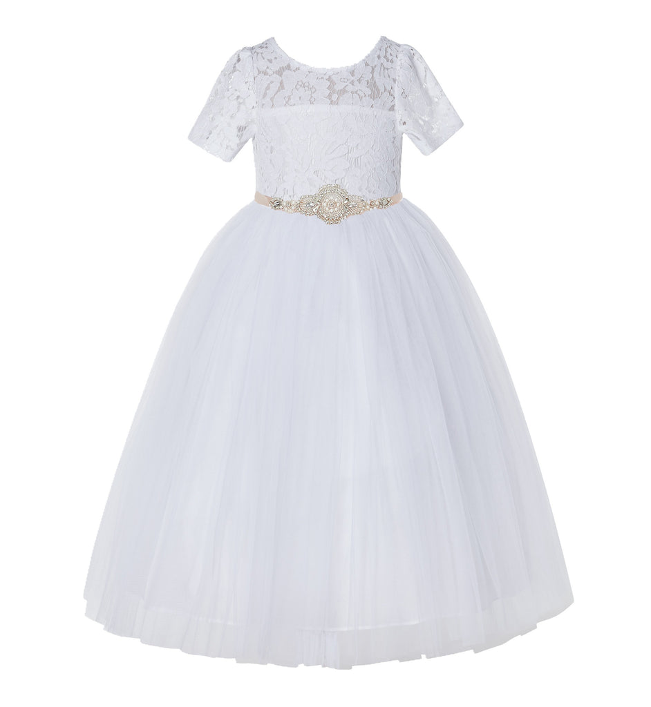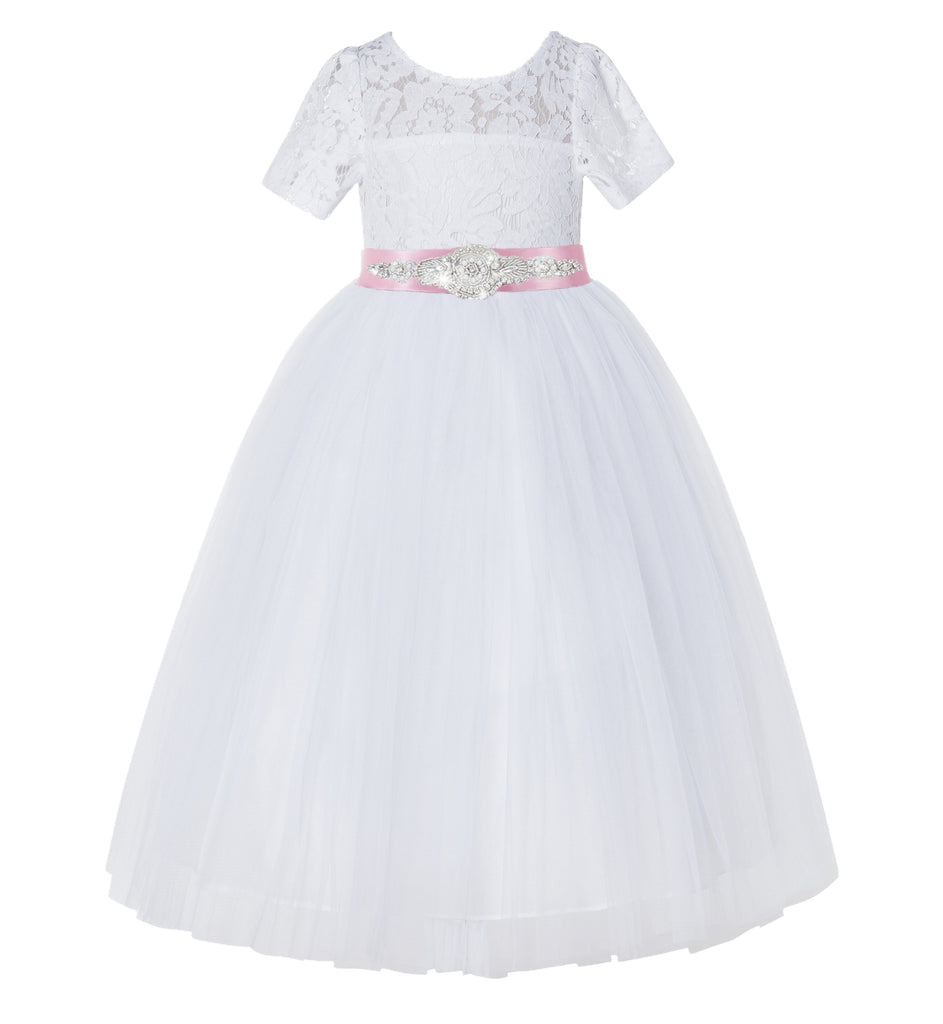 White Floral Lace Flower Girl Dress with Sleeves Pretty Princess Gown Special Occasion Dresses LG2R7
