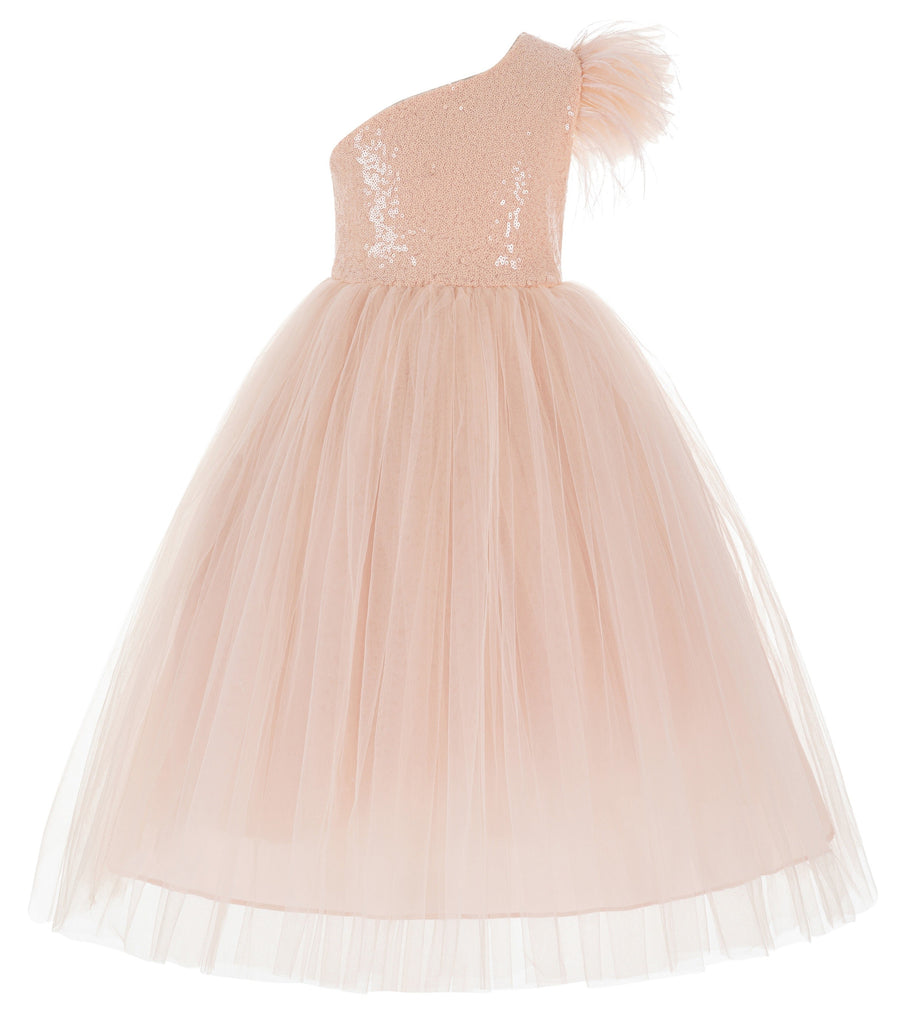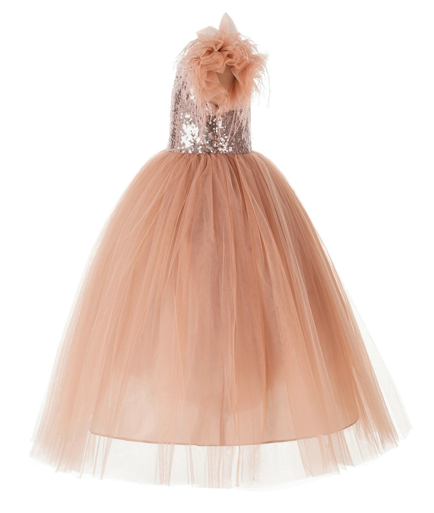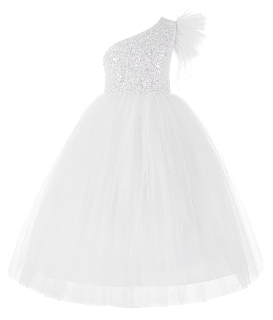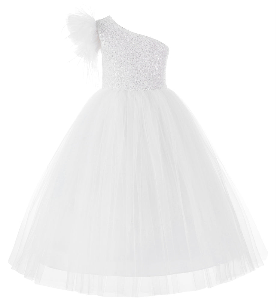 One Shoulder Feather Flower Girl Dress Junior Bridesmaid Gown Communion Baptism Christening OS2