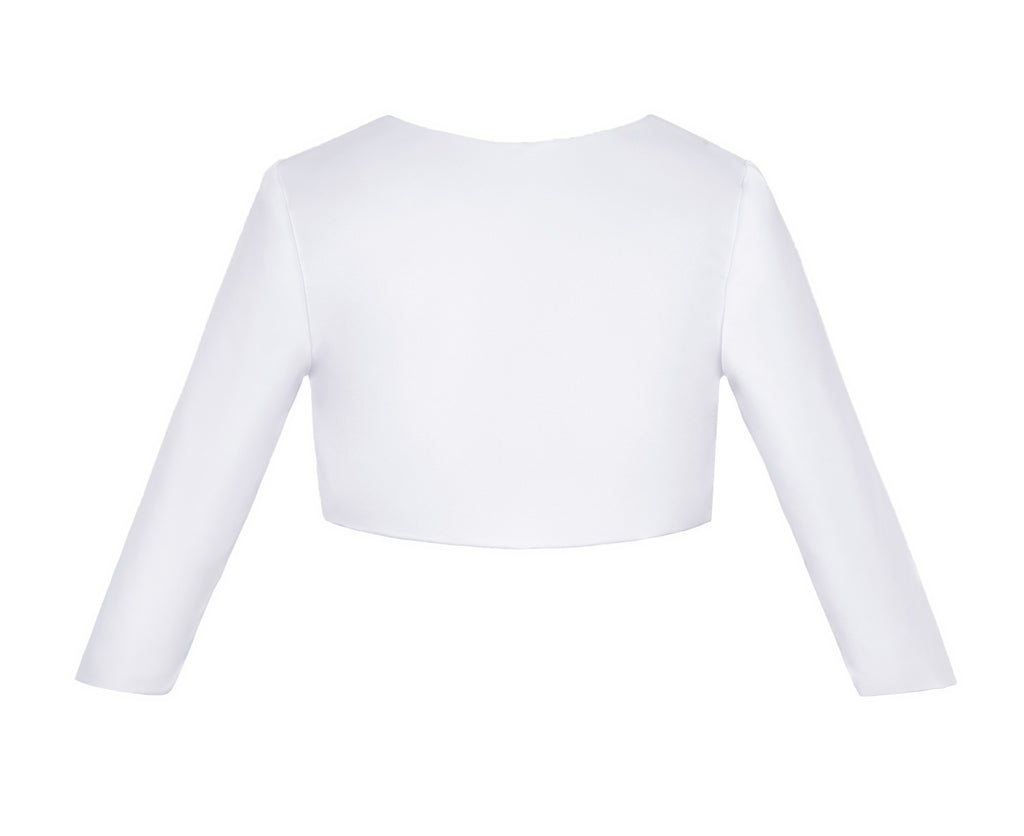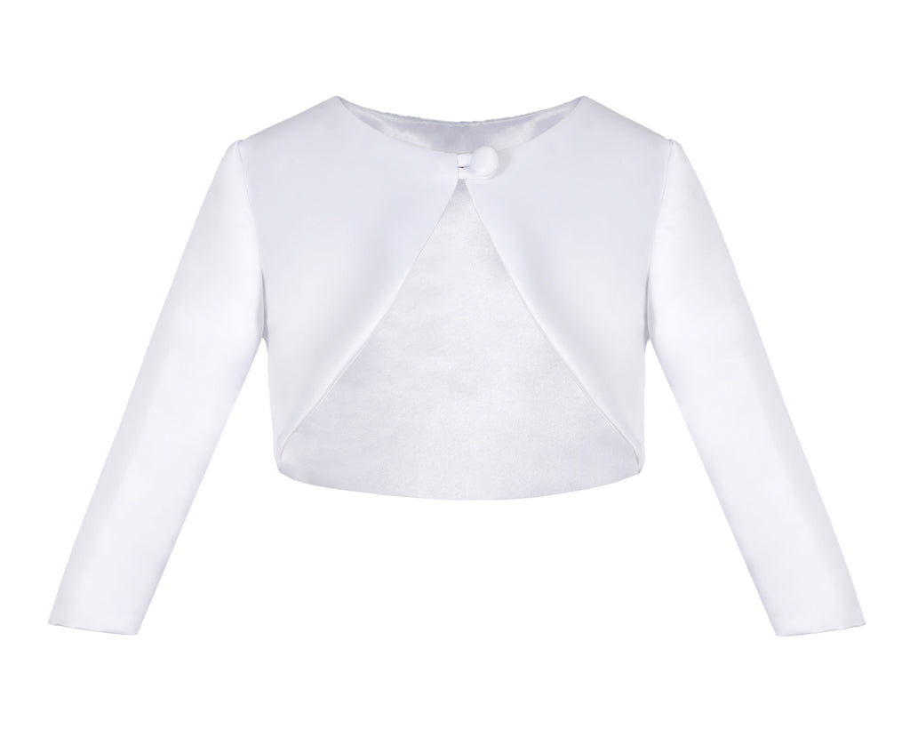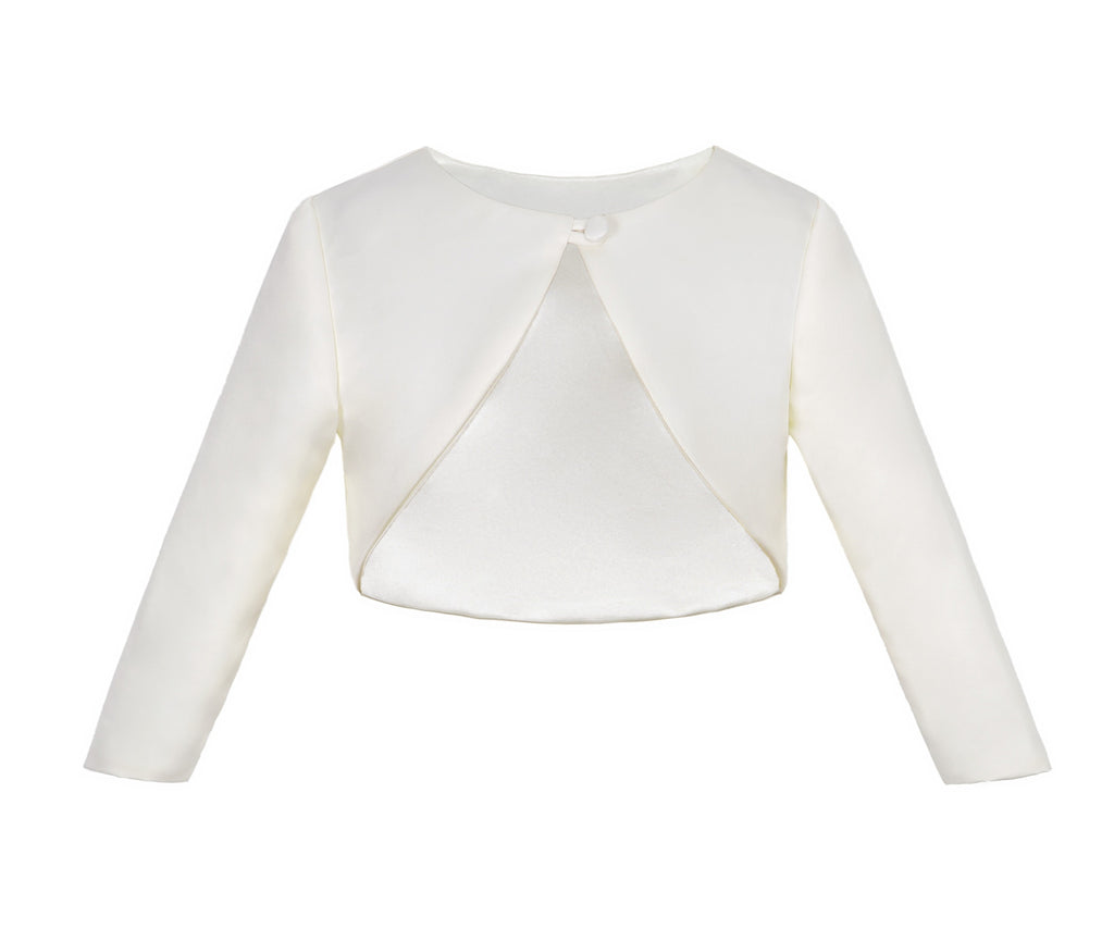 This long sleeves bolero made of elegant smooth satin with a single button closure It will be a perfect accessory to go with any dress!