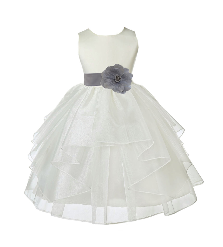 - The elegant feature is made out of Ivory Satin Poly upper body and sleeveless bodice with an elegant 5 tiered Shimmering Organza skirt. The waistline is decorated with a removable Color of your choice Satin Poly Sash and Flower to make this dress more elegant.