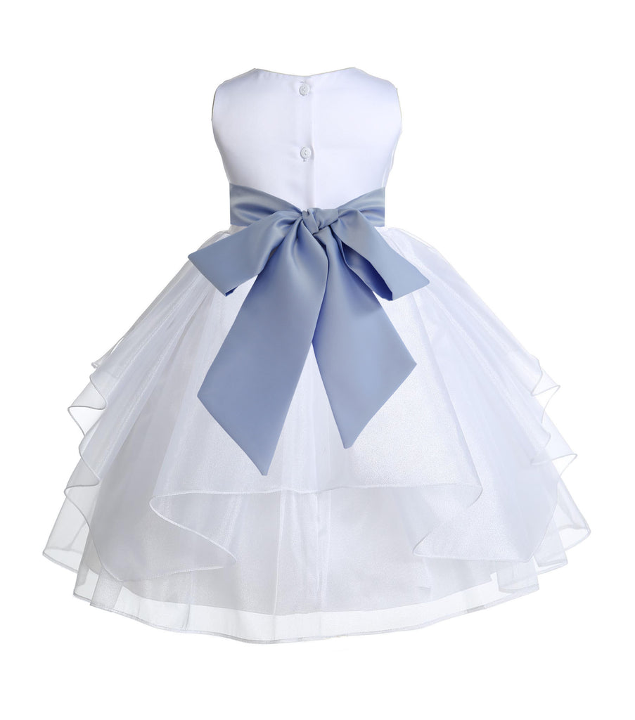 • The elegant feature is made out of white Satin Poly upper body and sleeveless bodice with an elegant 5 tiered Shimmering Organza skirt. The waistline is decorated with a removable Color of your choice Satin Poly Sash and Flower to make this dress more elegant.