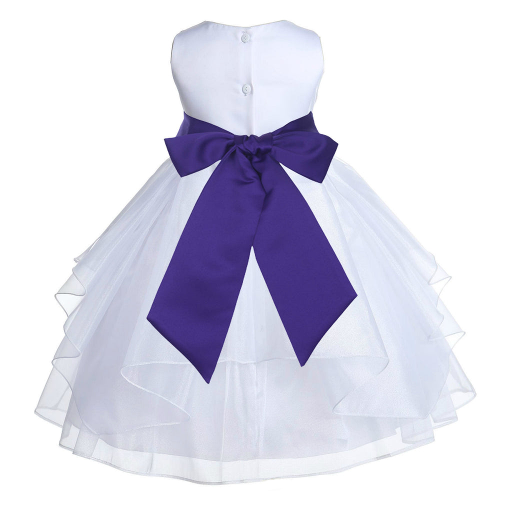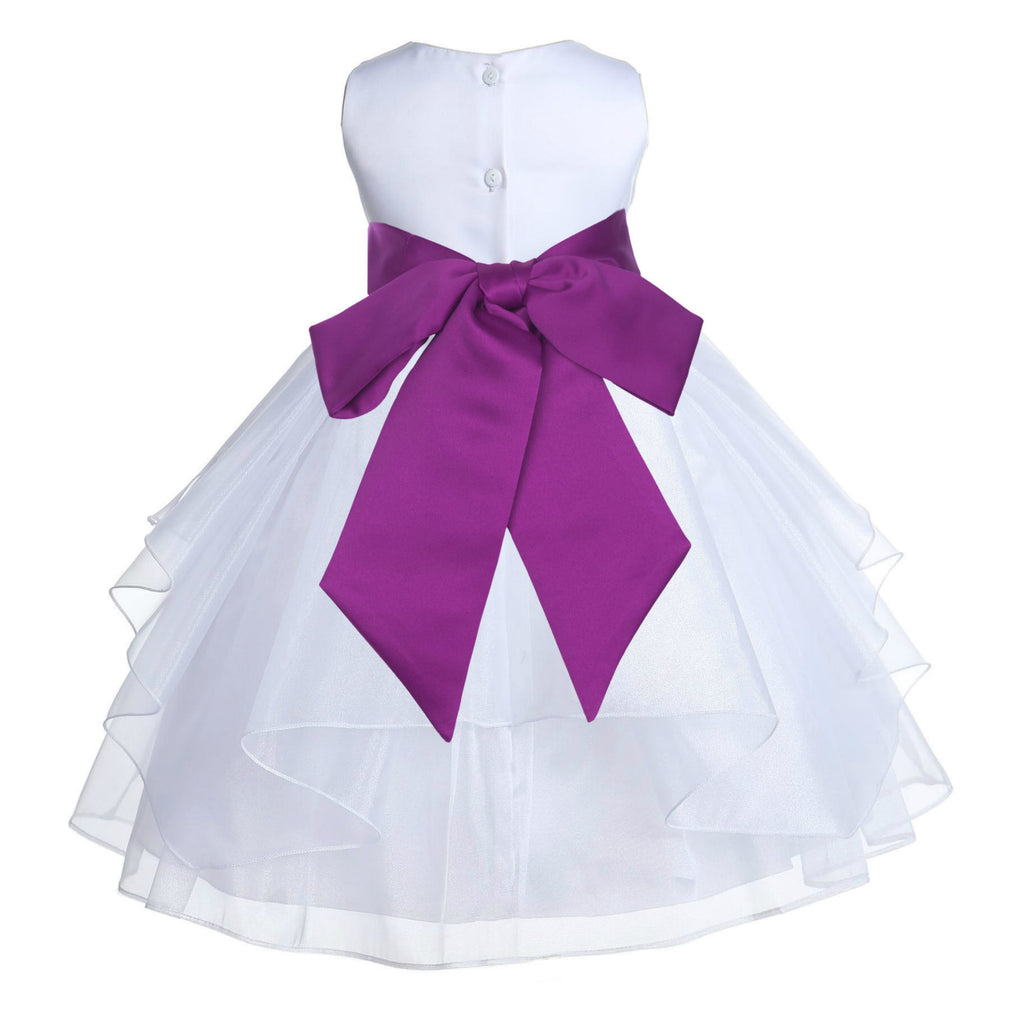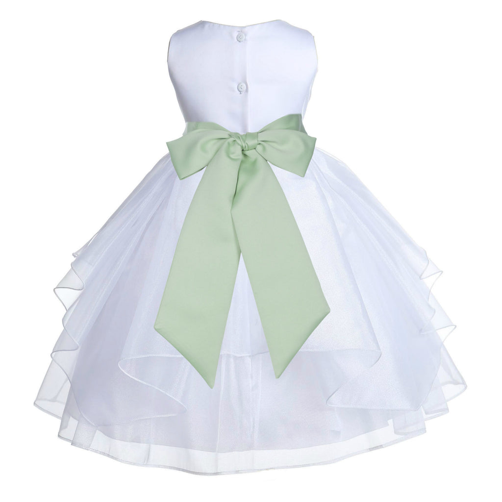 • The elegant feature is made out of white Satin Poly upper body and sleeveless bodice with an elegant 5 tiered Shimmering Organza skirt. The waistline is decorated with a removable Color of your choice Satin Poly Sash and Flower to make this dress more elegant.