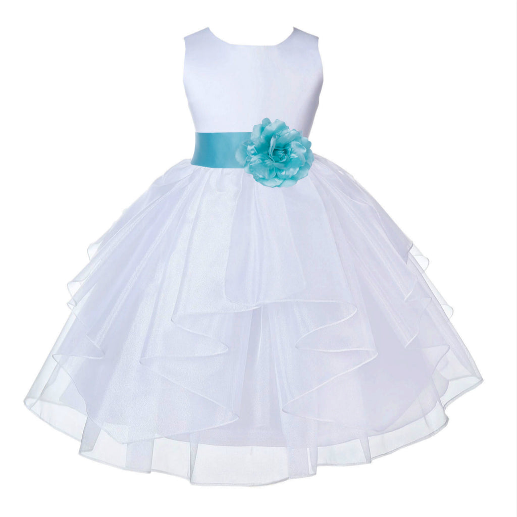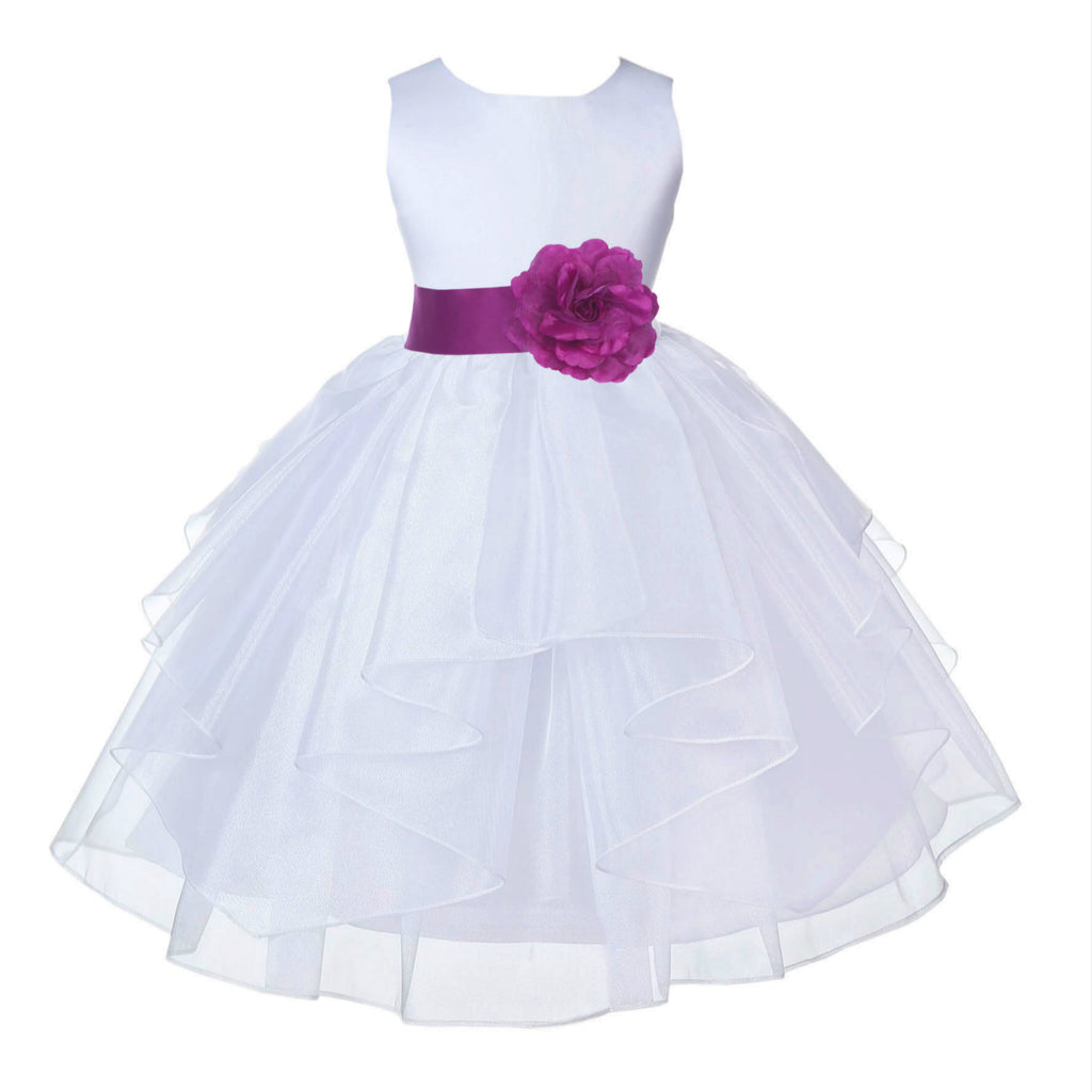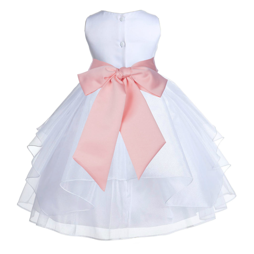 • The elegant feature is made out of white Satin Poly upper body and sleeveless bodice with an elegant 5 tiered Shimmering Organza skirt. The waistline is decorated with a removable Color of your choice Satin Poly Sash and Flower to make this dress more elegant.