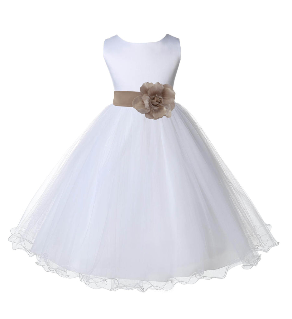 - The elegant upper bodice feature is made out of white Satin Poly. The waistline is decorated with a removable choice of color sash and flower to make this dress more elegant. The back of the dress has a zipper closure and a nice bow you can tie for a snug fit.
